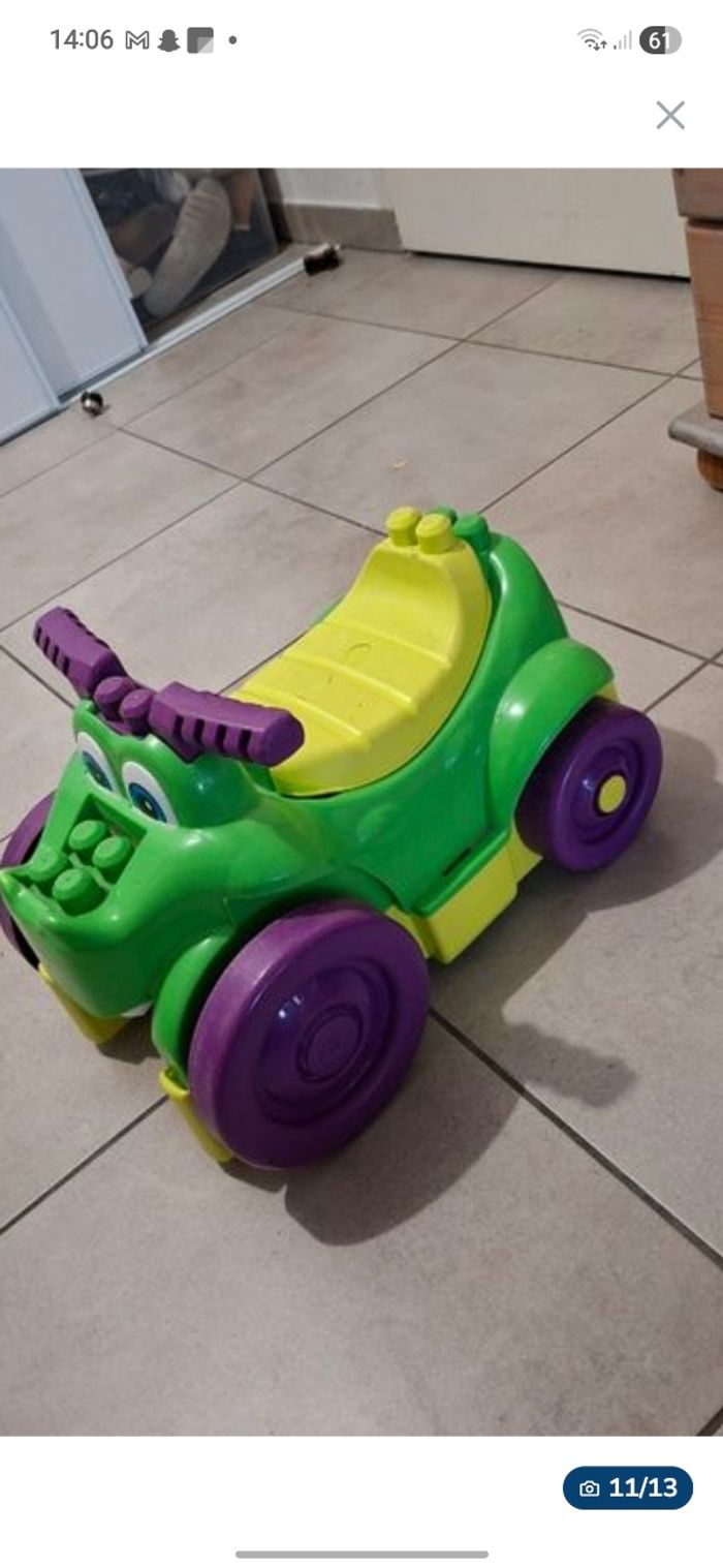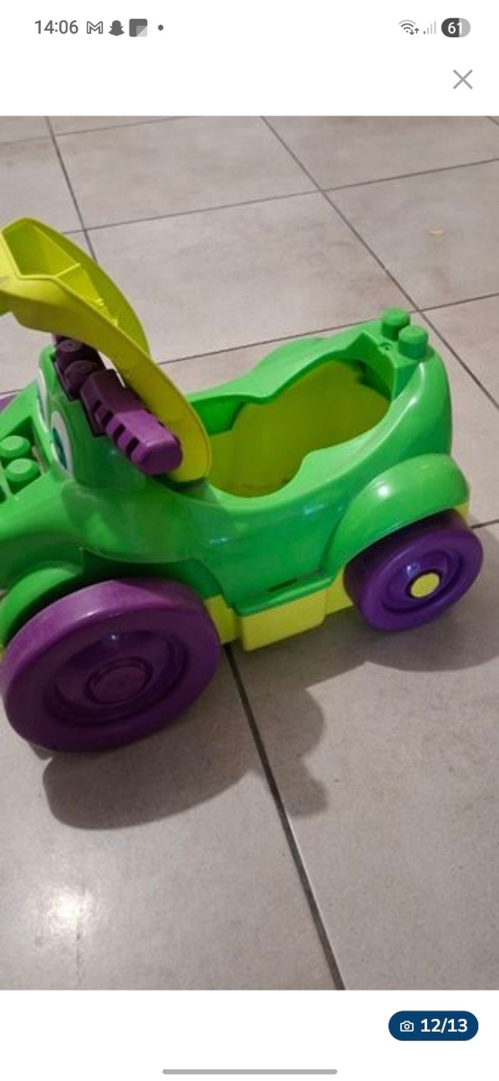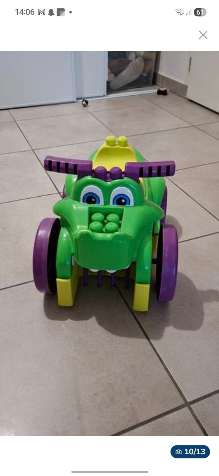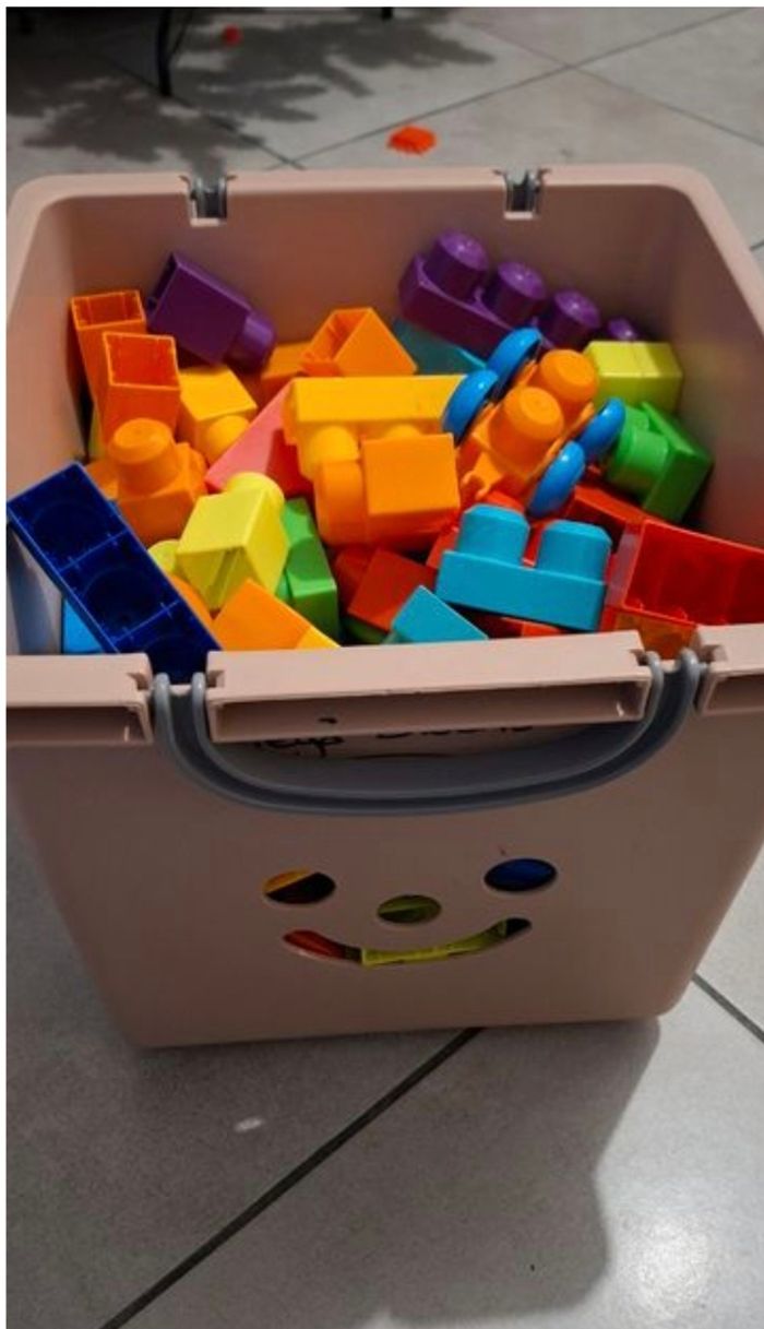Lot méga Block contenant une caisse avec au minimum 250 pièces + la table de construction (elle s'ouvre pour y ranger des pièces et se plie pour la ranger plus facilement) + un chariot pour y ranger les pièces ou autres.. + le porteur style crocodile qui permet de ramasser les pièces par terre, en passant sur les pièces le crocodile les avales et elle finissent dans le coffre sous la selle.