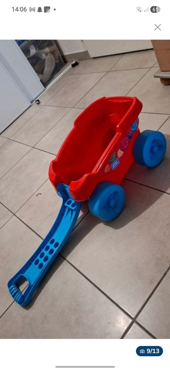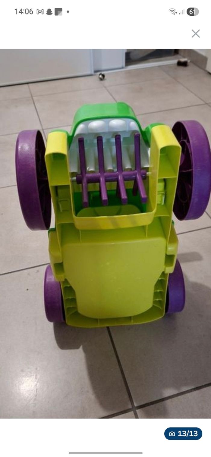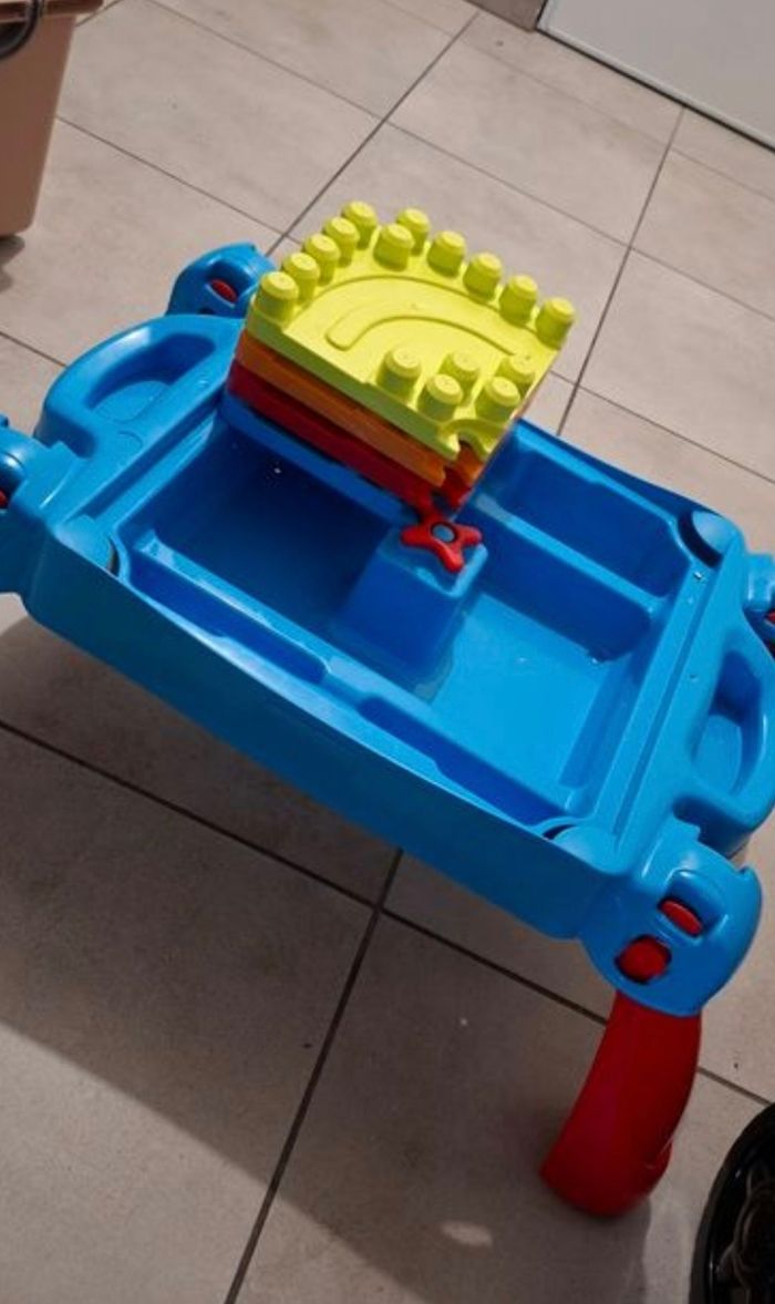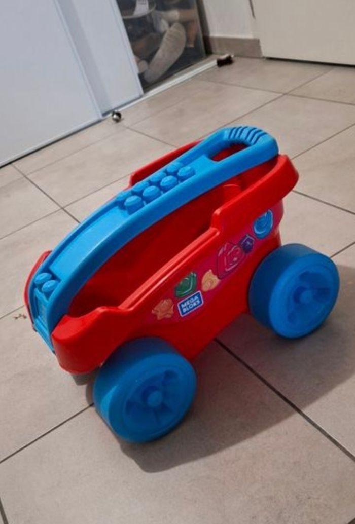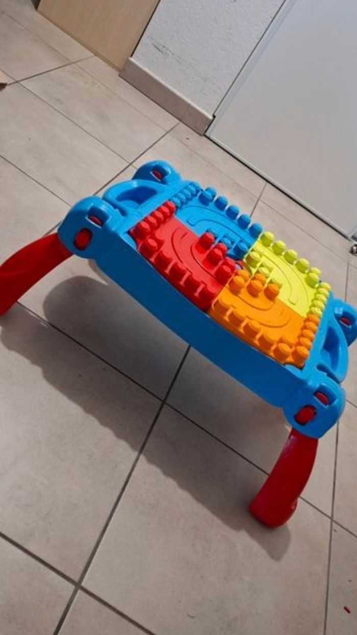 Lot méga Block contenant une caisse avec au minimum 250 pièces + la table de construction (elle s'ouvre pour y ranger des pièces et se plie pour la ranger plus facilement) + un chariot pour y ranger les pièces ou autres.. + le porteur style crocodile qui permet de ramasser les pièces par terre, en passant sur les pièces le crocodile les avales et elle finissent dans le coffre sous la selle.
