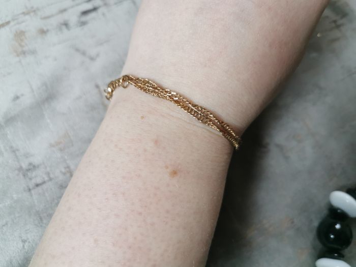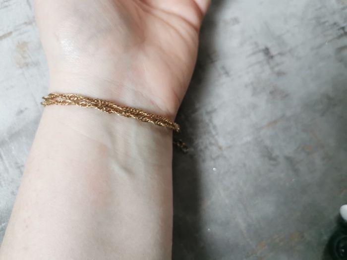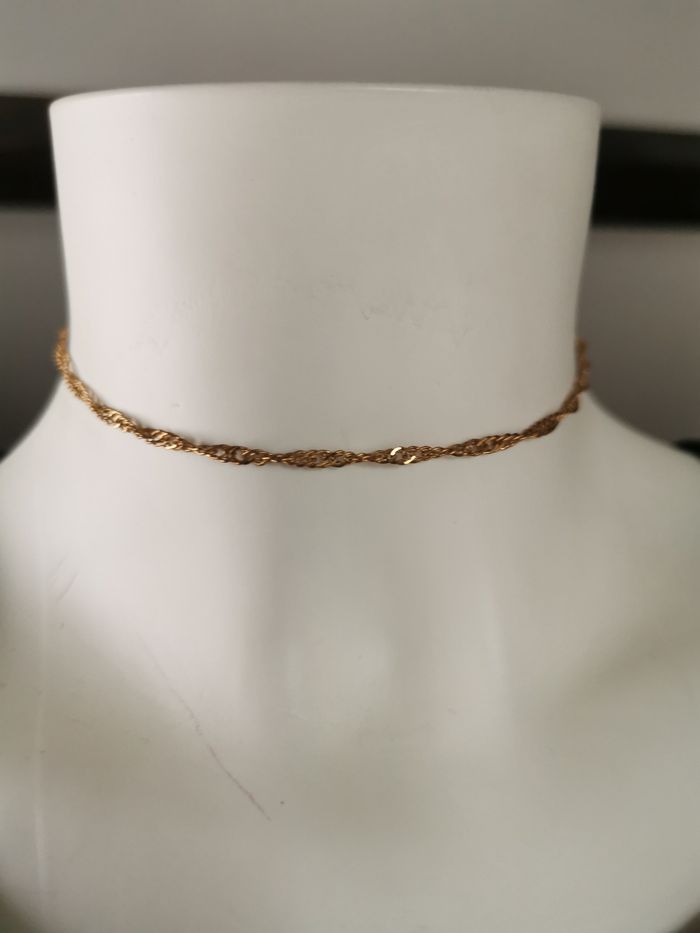 Chaîne en maille torsadés plate dorée 3mm d'epaisseur et 35 cm de long la rallonge y compris, poids 2g. Belle chainette en très bon état, peut-être portée en bracelet en l'enroulant autour du poignet.