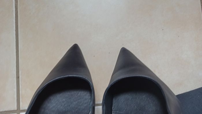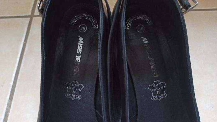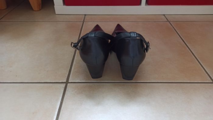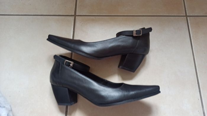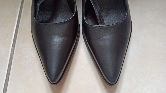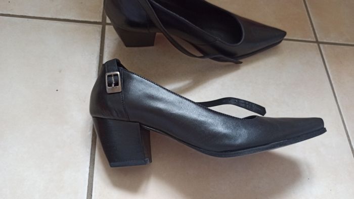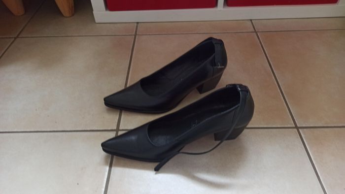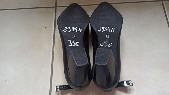 Escarpins taille 38. Dessus, doublure et sous pied cuir. Hauteur talon 6 cm. Parfait état comme neuves. Portées 1 fois. Achetés 38€ (le prix est indiqué sur la semelle extérieure)