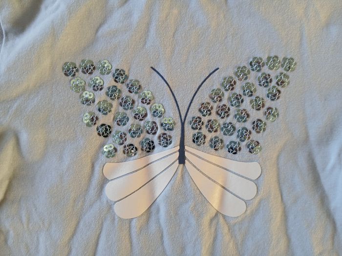 T-shirt à manches longues bleu ciel, dessin d'un papillon en strass sur le devant. Taille 3 ans / 98 cm Marque Okaidi Très bon état