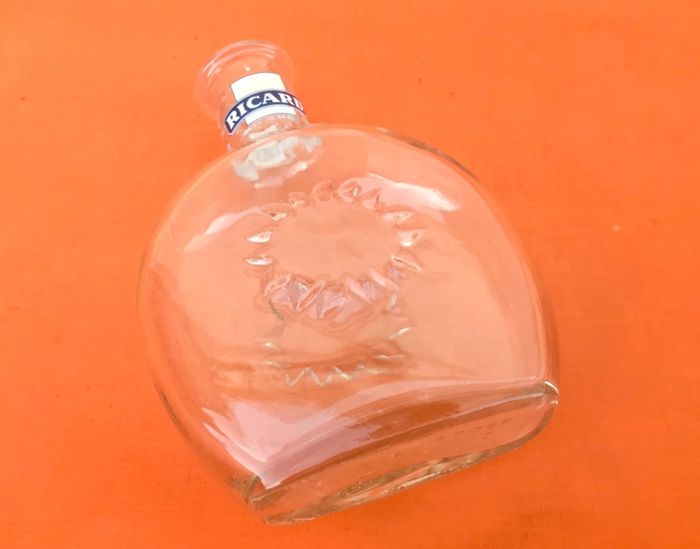 Carafe publicitaire avec son bec verseur Ricard "soleil " Verre transparent Modèle déposé Hauteur totale : 240mm Longueur : 140mm Largeur : 50mm Poids total : 560grs