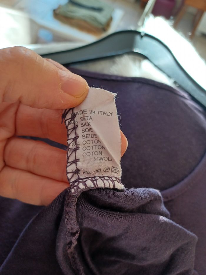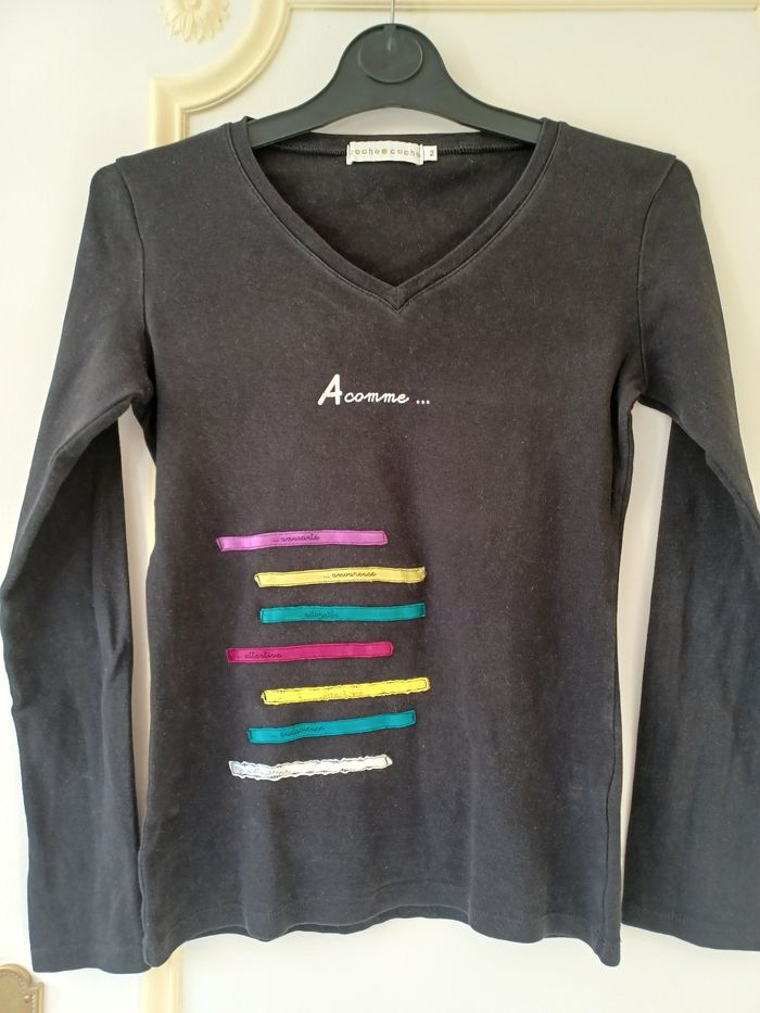 3 T-shirts de marques différentes : -1 T-shirt Cache-cache taille 2 noir avec bandes ruban multi couleurs. La jaune et la blanche un peu déformées voir photo. En coton -1 T-shirt violet foncé, étiquette coupée 60% soie, 140%coton pates boutonnée aux manches, des petits défauts sur le col voir 6ème photo. 1- T-shirt SCHOOL RAS indiqué taille 3 mais taille réelle 2, en coton