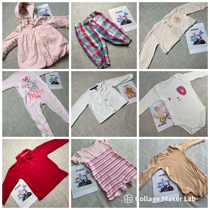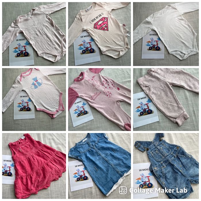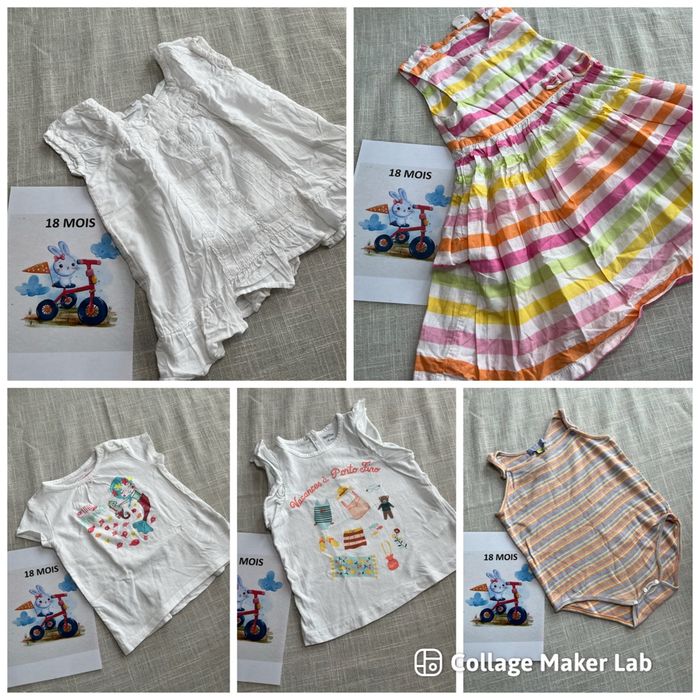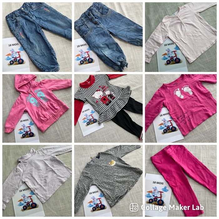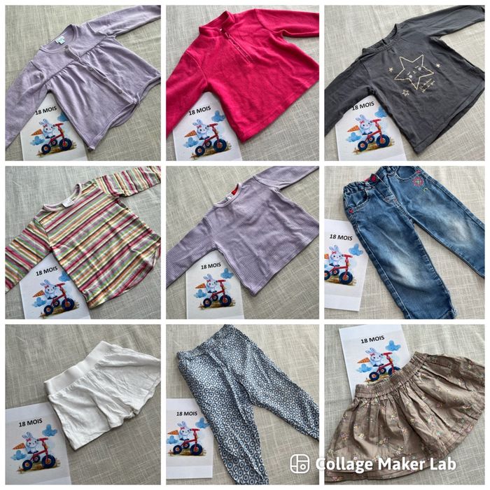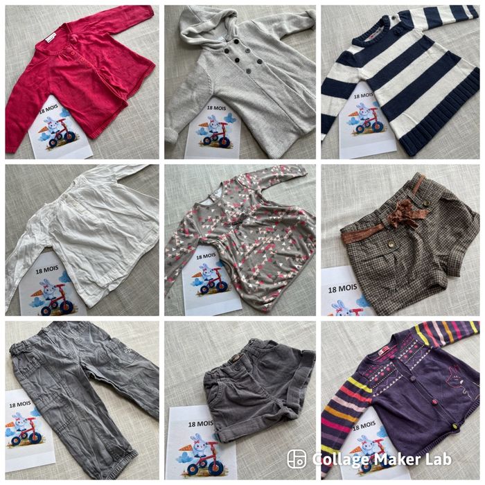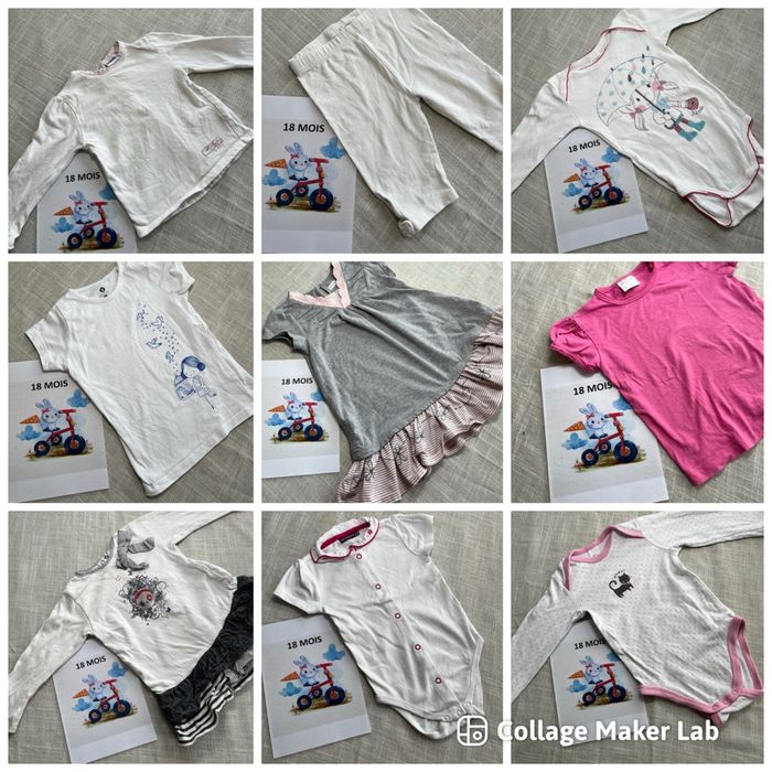 Je vends plusieurs vêtements taille 18 mois, pour fille. 👕 Articles pour été et hiver : t-shirts, pantalons, pulls, pyjamas… 👚 Marques variées : Kiabi, DPAM, In Extenso, Petit Bateau… 📦 Possibilité de composer un lot selon vos besoins 📦 Vente à l’unité également possible Tous les états sont précisés sur chaque article et visibles en photos dans les annonces à l’unité. 📩 N’hésitez pas à m’écrire pour toute question ou pour créer un lot. Je vous aiderai avec plaisir