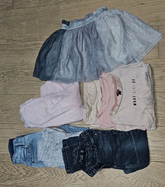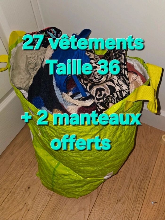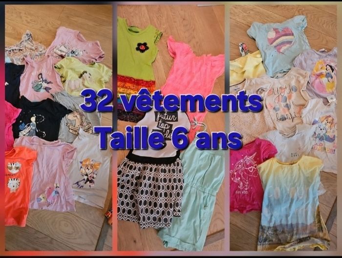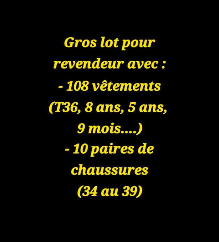 Gros lot revendeur avec : => 108 VÊTEMENTS = 40€ - 29 vêtements T36 - 12 vêtements T5 ans fille - 32 vêtements T6 ans fille - 16 vêtements T8ans fille - 2 chemises TL homme - 5 vêtements 18/24 mois fille - 13 vêtements 9 mois fille Tous sont en bon ou très bon état => 10 paires de chaussures = 15€ fille/femme entre 34 et 39 dont 8 sont neuves LE LOT ENTIER VÊTEMENTS ET CHAUSSURES À 50€ Possibilité d'acheter les lots de manière séparée Remise en main propre possible sur Lyon ou envoi soigné Des réductions s'appliquent sur les lots