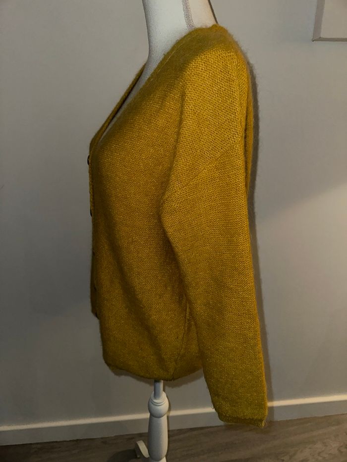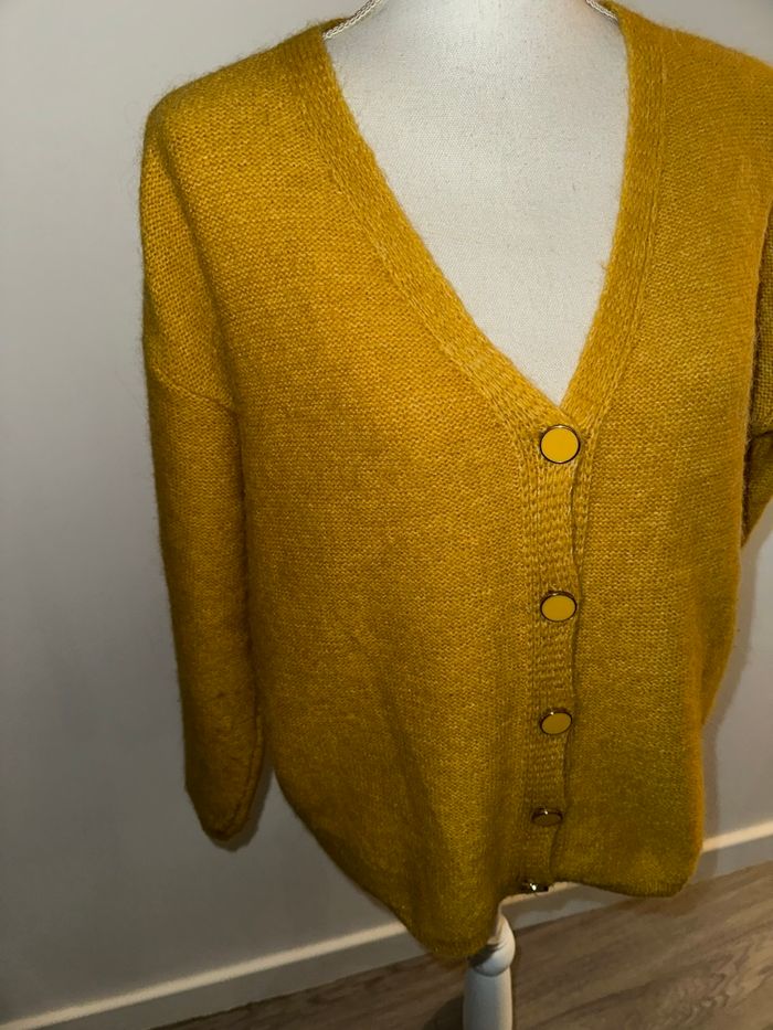 Cardigan - Excellent état - Taille 44 équivalent XXL Dimensions en bas de l'annonce - Jaune moutarde - Se ferme avec des boutons - Col en V - Ultra doux et chaud - Laine et alpaga - Coupe loose oversize - Pas d'étiquette de taille ni de matière Dimensions: - 63cm niveau aisselles - 60cm de long