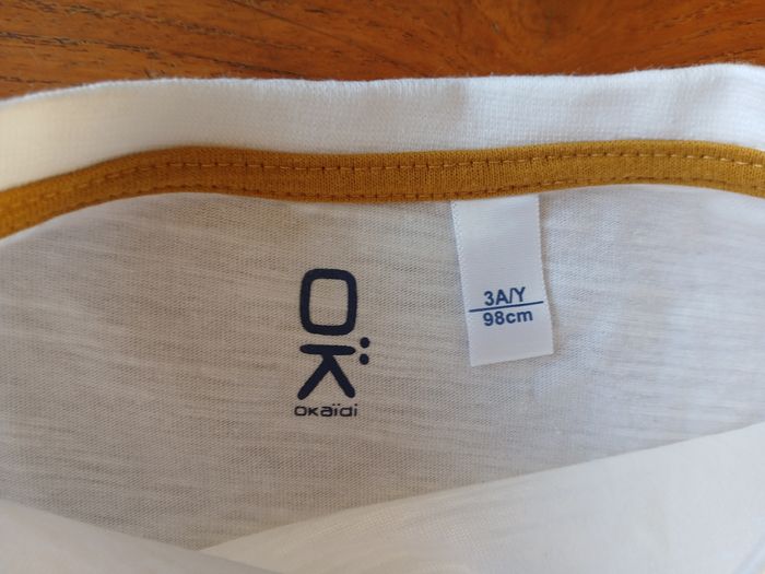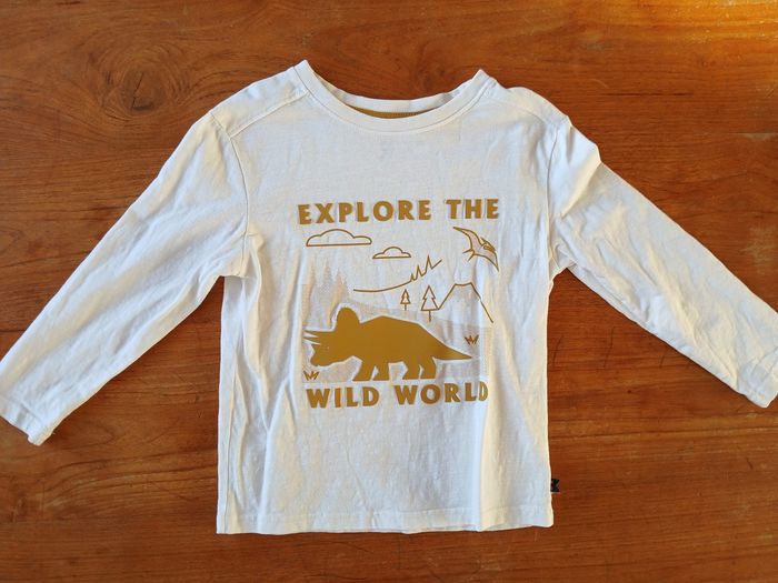 T-shirt à manches longues blanc, marqué en jaune "Explore the wild World" avec dessins de dinosaures. Écritures légèrement en relief. Taille 3 ans / 98 cm Marque Okaidi Très bon état
