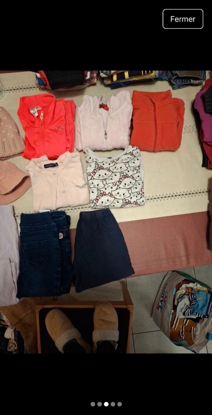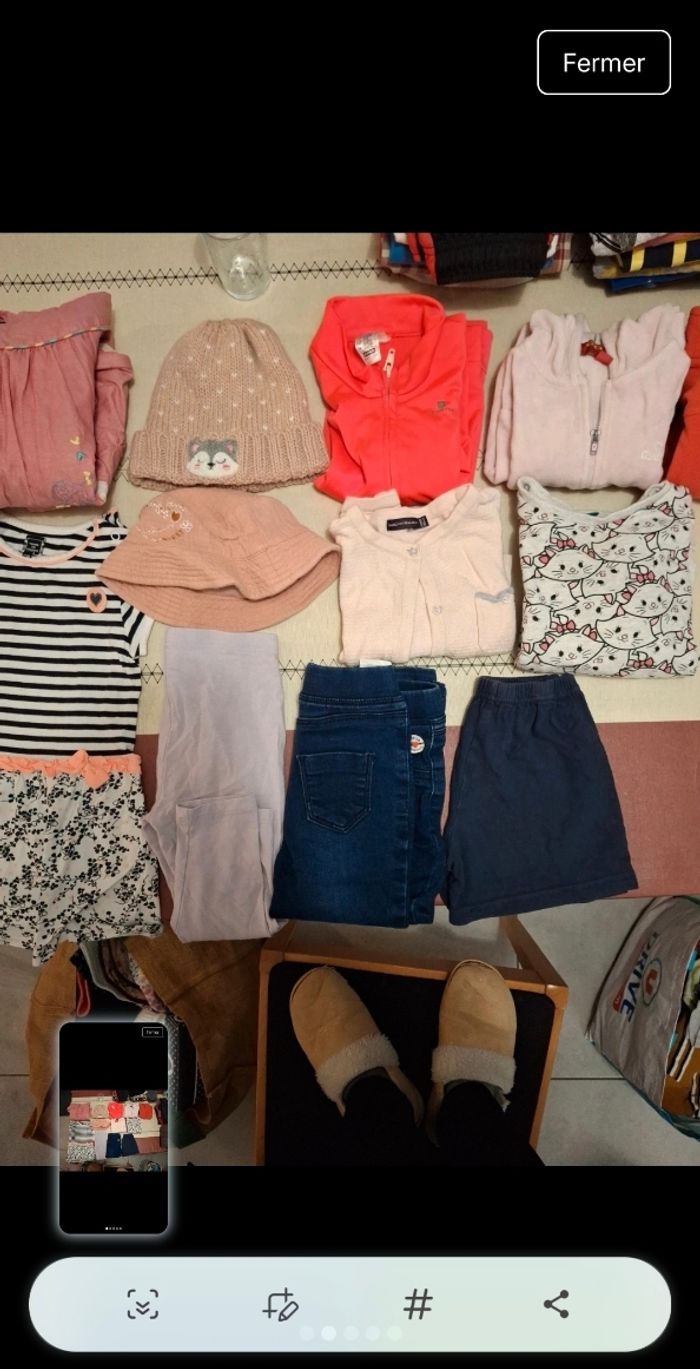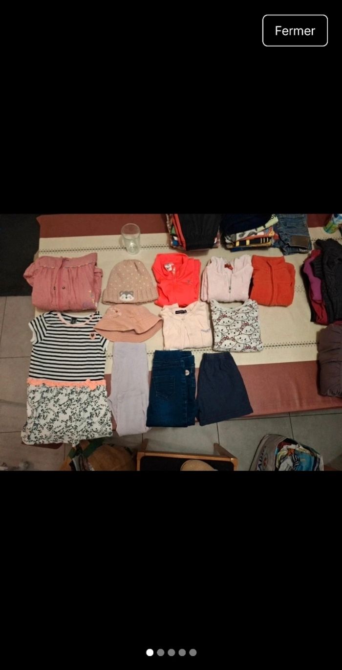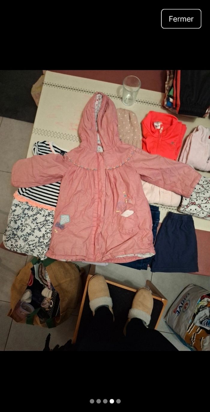 Lot vêtements 2 ans fille : - 1 manteau mi saison - 1 robe manche courte - 1 bonnet - 1 chapeau - 1 legging - 1 short pyjama - 1 pantalon - 3 vestes dont 1 avec quelques signes d'usure au manche - 1 Polaire - 1 sweat avec 1 petite tâche en bas (voir photo)