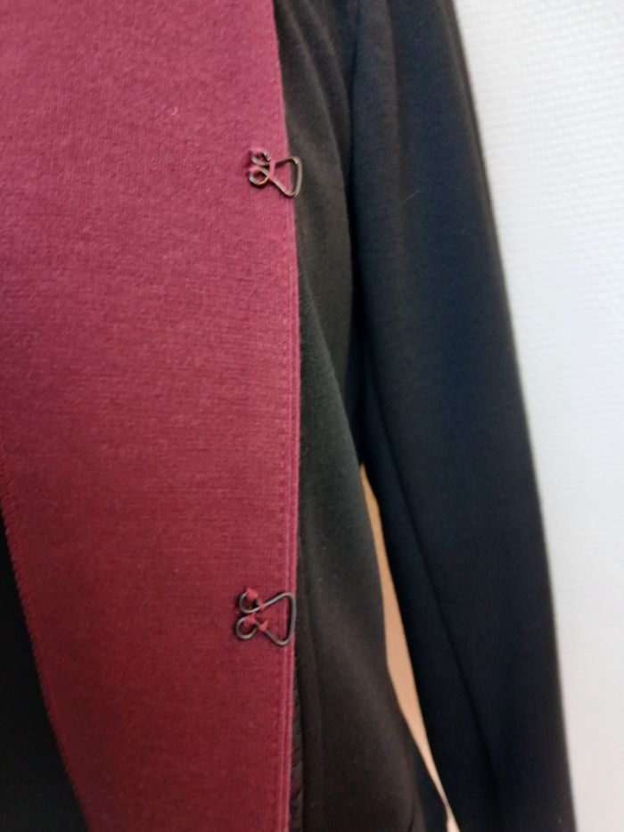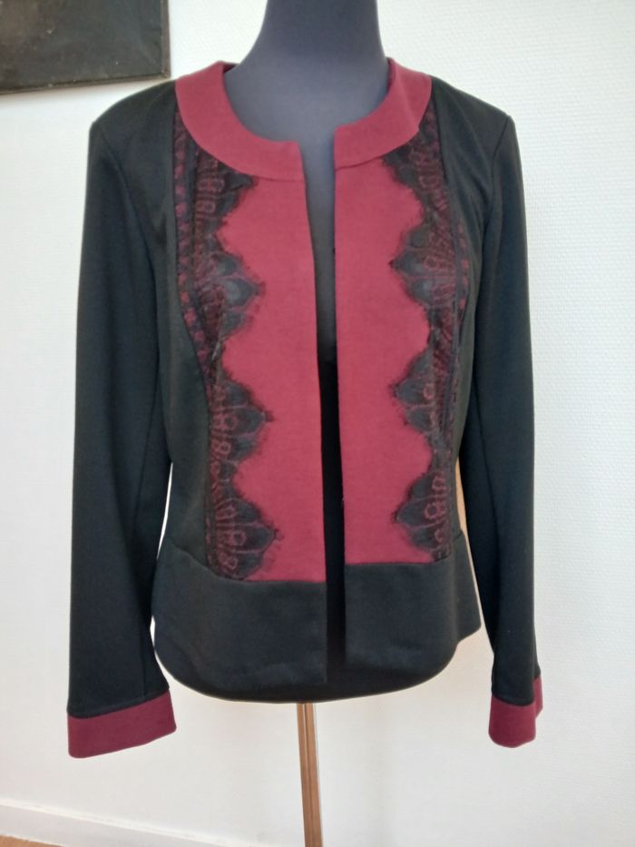 veste structurée de la marque La Maison du Jersey, en excellent état. ​Couleurs : Noir et bordeaux (lie-de-vin). ​Détails : Magnifiques empiècements de dentelle noire sur le devant. Finitions soignées avec poignets bordeaux. ​Fermeture : Crochets invisibles sur le devant (agrafes). ​Taille : 42 (FR) / 14 (UK). ​