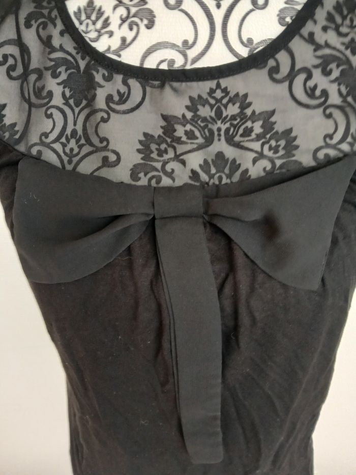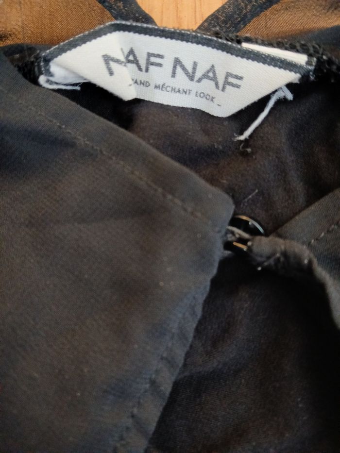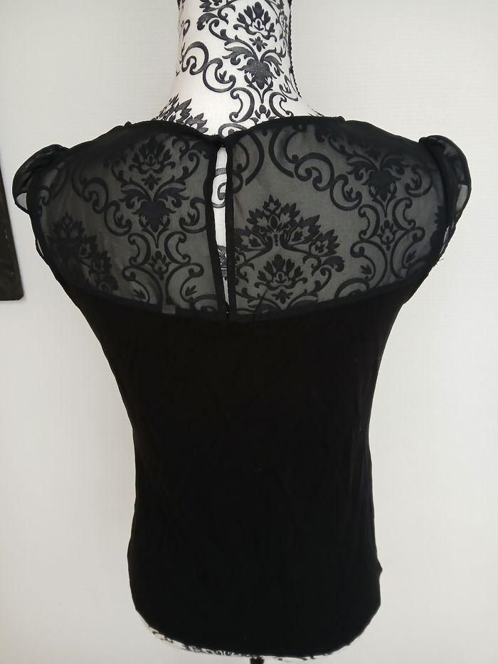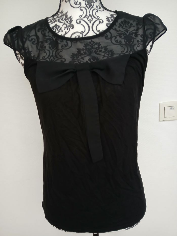 Vends joli haut noir de la marque Naf Naf, taille S. ​Détails : Haut du buste et dos en voile transparent avec motifs baroques floqués. ​Style : Grand nœud décoratif sur le devant, manches très courtes. ​Fermeture : Petit bouton au dos avec ouverture goutte d'eau. ​État : Très bon état.
