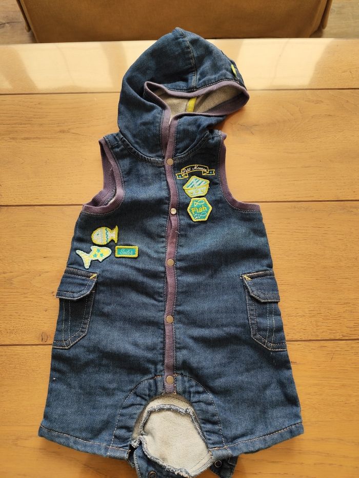 Lot vêtements bébé garçon taille 3 mois 1 Combi short avec capuche et pressions de haut en bas et entrejambe 1 tee shirt avec pressions de haut en bas dans le dos 1 petite chemise avec boutons de haut en bas