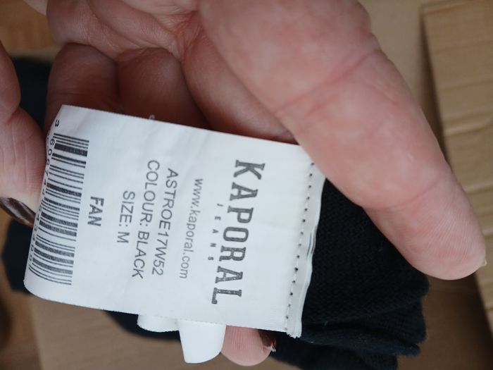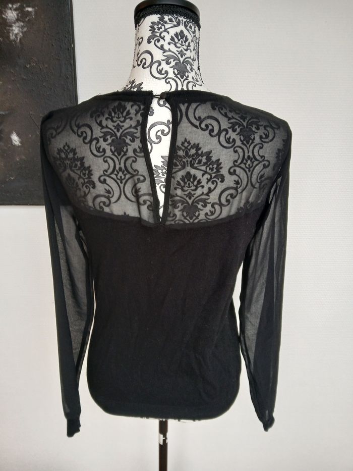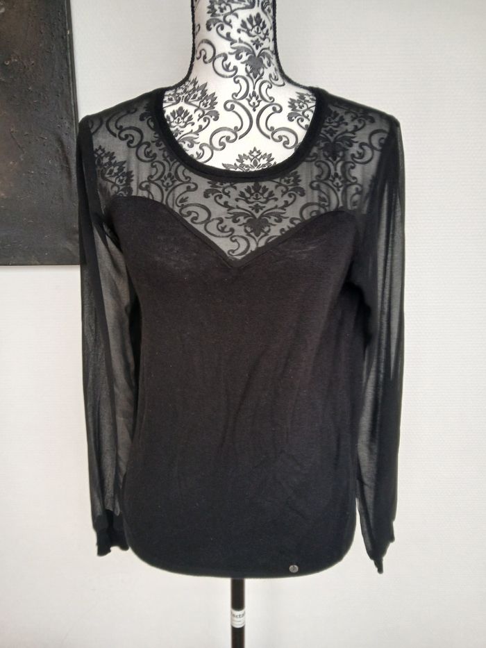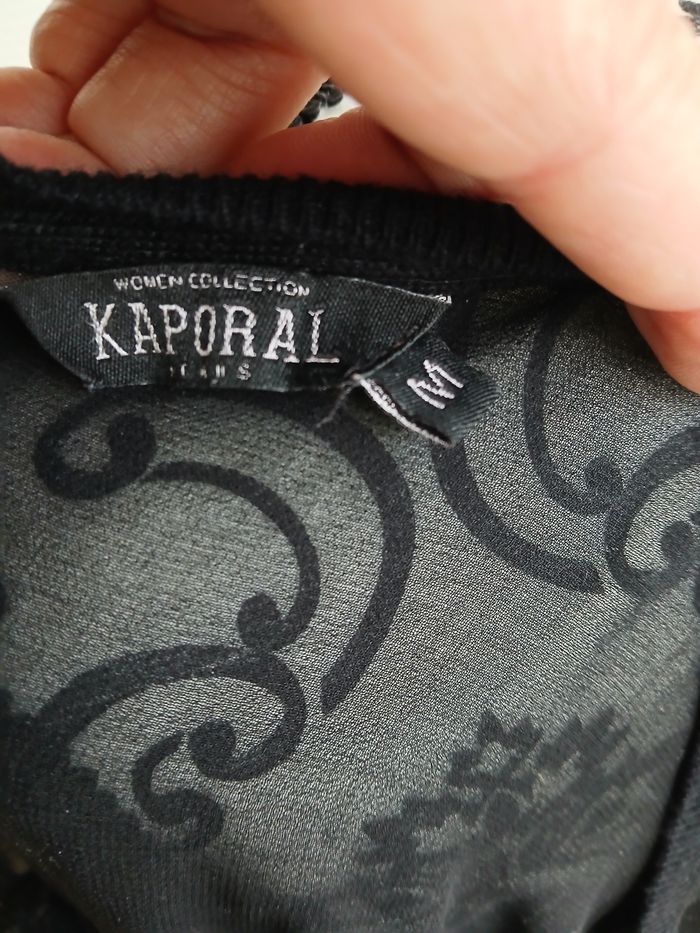 haut élégant de la marque Kaporal (modèle Astroe), couleur noir, taille M. ​Très joli design bi-matière : ​Haut du buste et manches : Voile transparent ​Corps : Maille fine, douce et extensible. ​Détails : Ouverture goutte d'eau avec bouton au dos, petit médaillon logo "K" en bas.