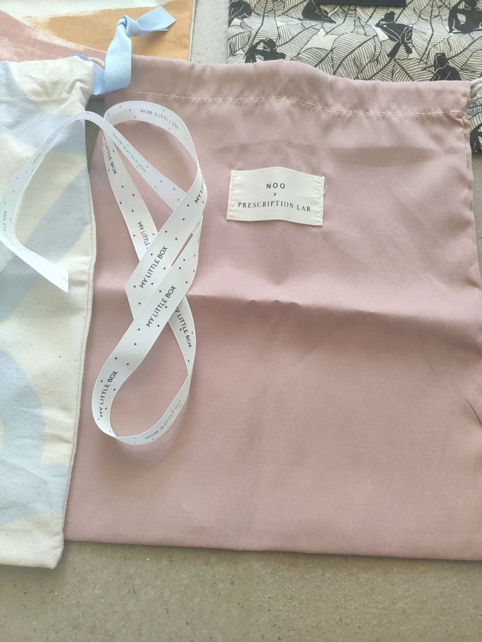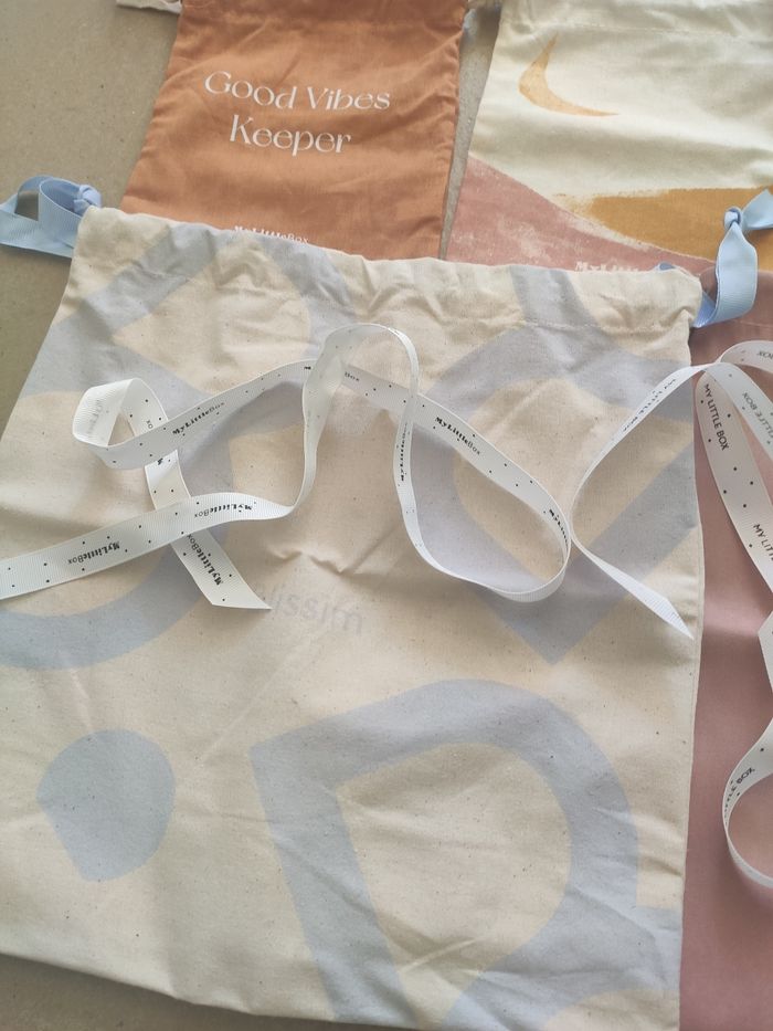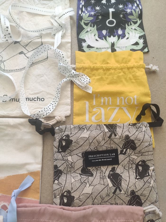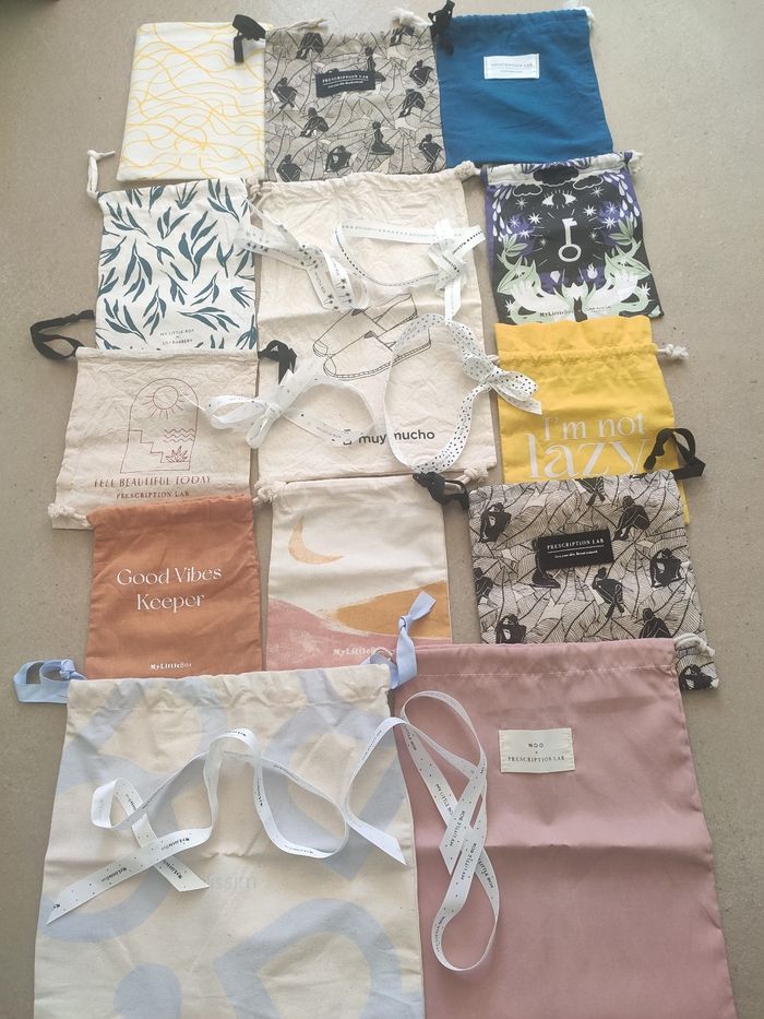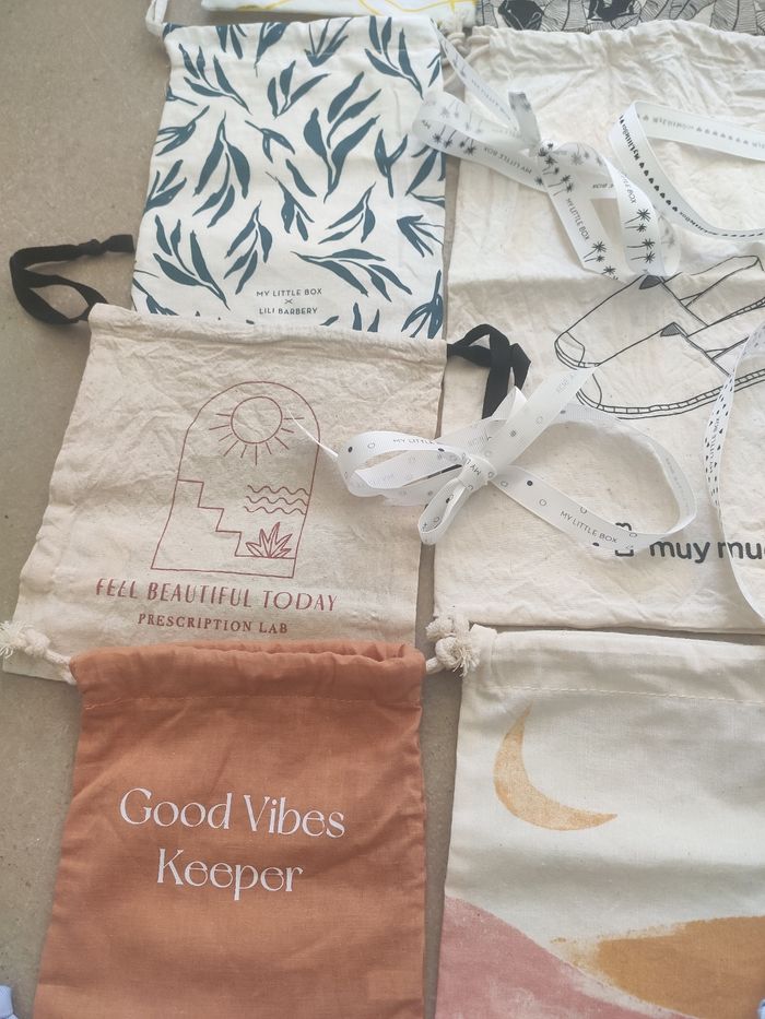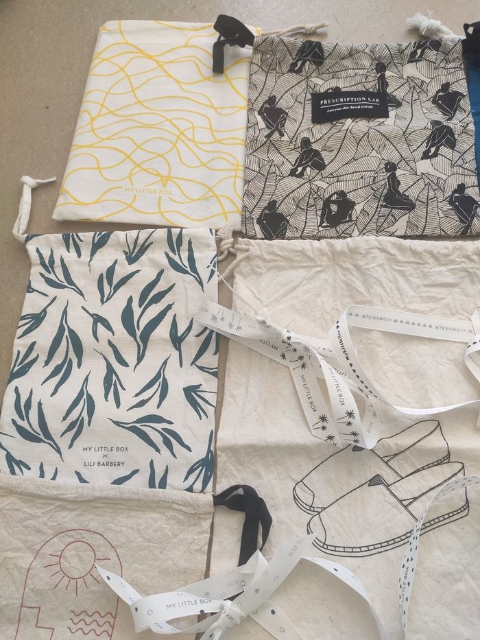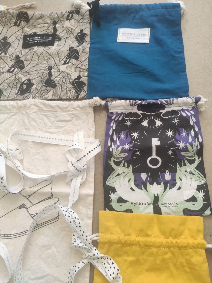 Plusieurs dimensions, de 15 cm x 17,5 cm jusque 30 cm x 29,5 cm. Ils sont tous neufs avec un lien de serrage. Le blanc à fleurs bleues en haut à gauche n'est plus disponible. Il y a un pochon qui garde à l'abri de l'eau. Vendu avec 6 rubans My Little Box. Issu de prescription lab, blissim et muy mucho