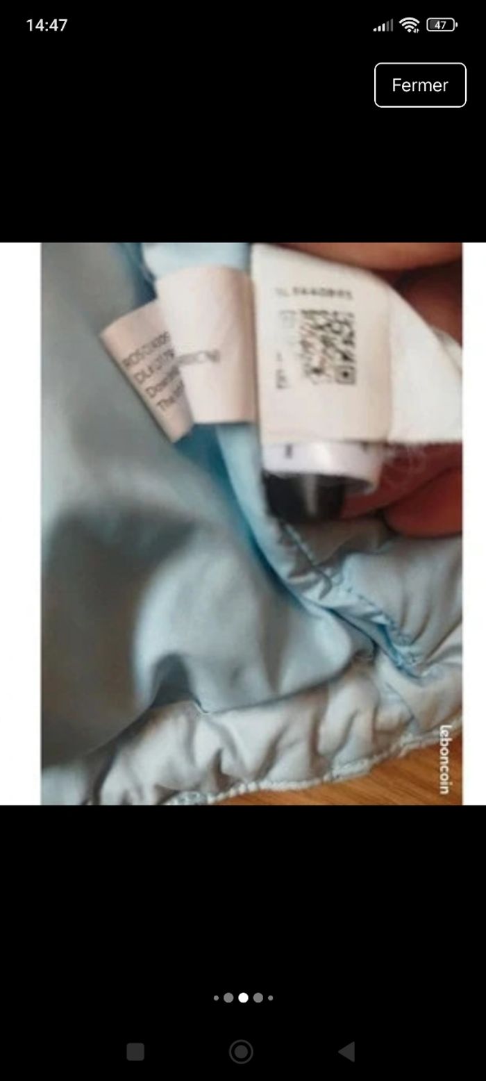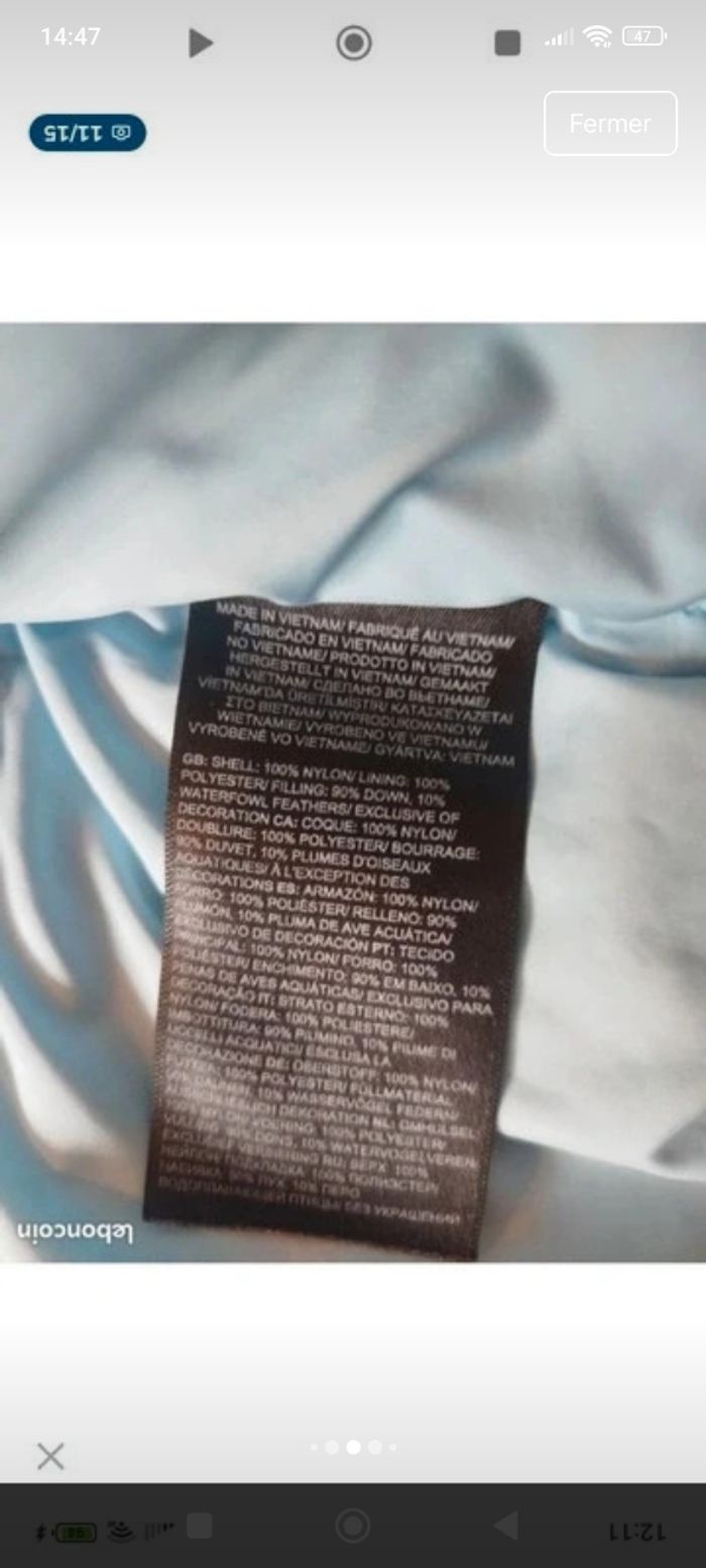 Portée mais reste en très bon état 👍 Pas de tâche, trou ou accro Un peu le logo qui s'efface sur la languette de la fermeture éclair 🥴 (dernière photo) Authentique Mixte Doudoune légère et chaude grâce au rembourage 90% duvet et 10% plumes Indice de chaleur : 700 Mixte Bi-couleur bleu clair et noir D'autres photos ou renseignements sur demande