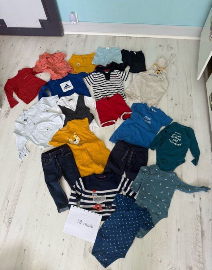 Lot 18 mois: - 1 pantalon Gemo - 1 jean Tape à l'Oeil - 1 pyjama short/tee shirt Kiabi - 1 pull sergent major - 1 pull Adidas - 2 shorts Week-end à la mer - 1 short douceur baby - 1 short Gemo - 1 salopette Du Pareil Au Même - 1 barboteuse Gemo - 1 tee shirt Weekend à la mer - 1 polo Gemo - 1 haut manche longue Gemo - 1 chemise manche longue Kiabi - 1 chemise manche courte + 1 veston Jean Bourget - 3 bodies Gemo