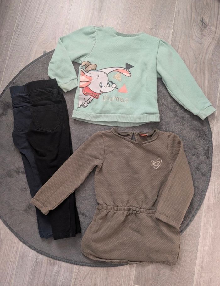 Lot de vêtements, comportant : • 1 sweat, marque Disney (bon état) • 1 robe , marque Tape à l'oeil (très bon état) • 2 leggings, marque Kiabi (très bon état)