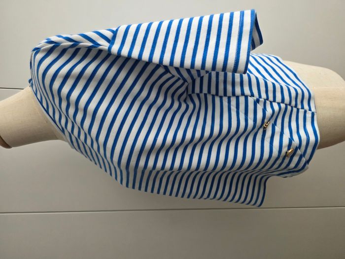 Pull de marque Kiabi, manches 3/4, taille L, 94% coton, 6% polyester. Rayé bleu / blanc, boutons déco.