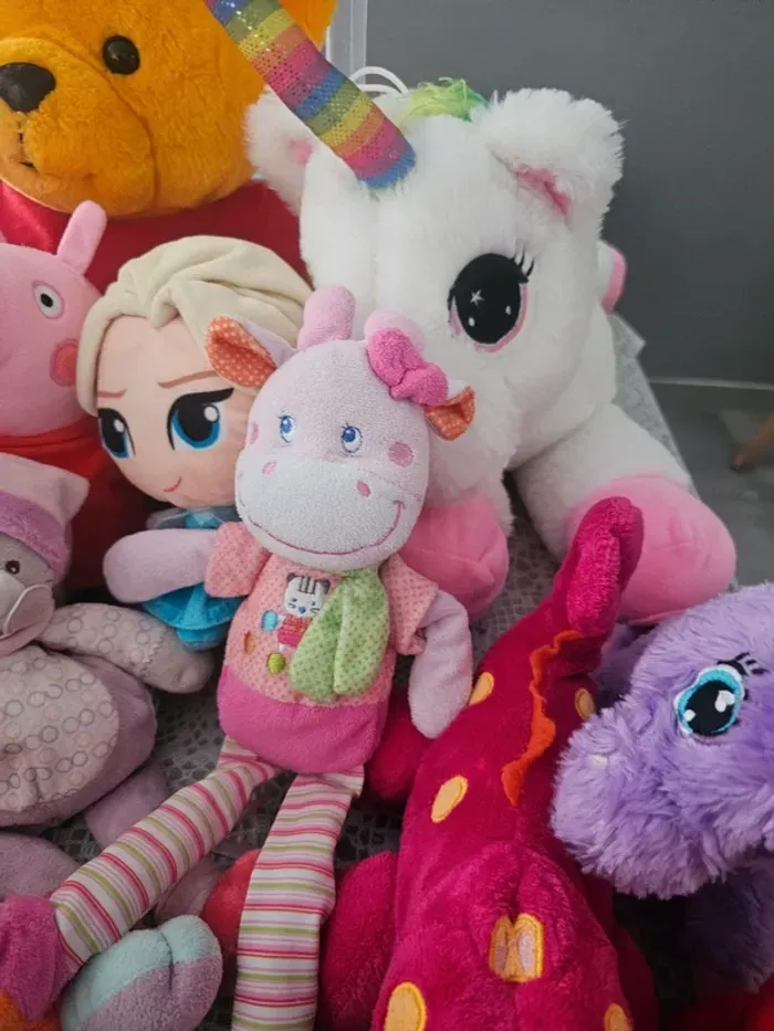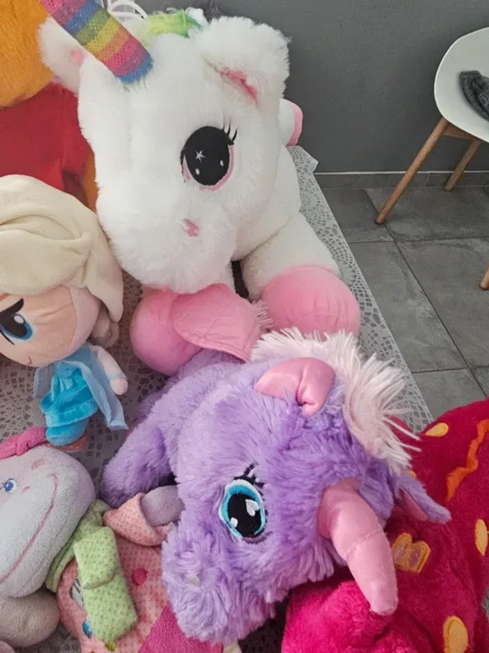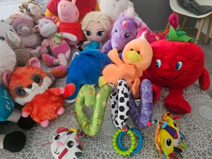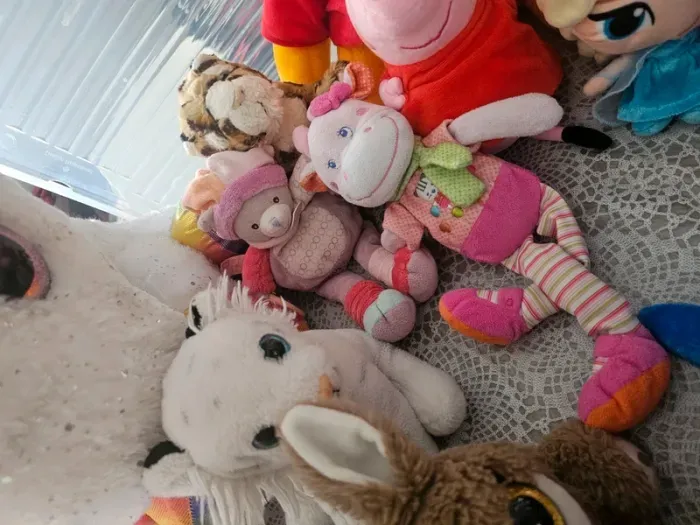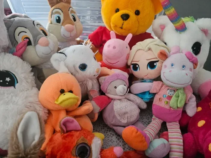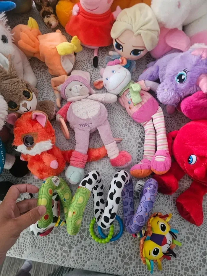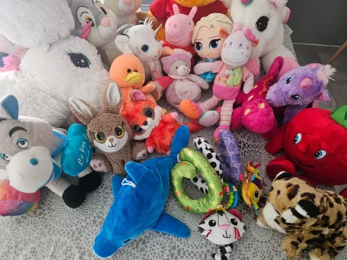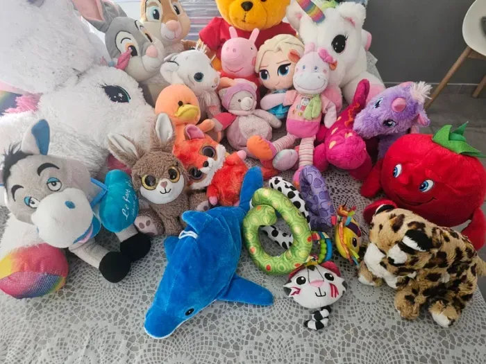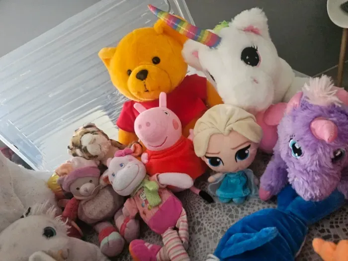 🧸✨ GRANDE BRADERIE DE DOUCEUR ! ✨🧸 Bienvenue au royaume des peluches trop mims 😍 Tu veux du kawaii ? Du doudou qui sent le propre ? Du perso connu à petit prix ? Clique et reste 💕 💌 Tu as repèrés un doudou ? Des peluches ? Alors n'hésite pas Envoie-moi un message avec ta sélection. 📦 Envoi mini format possible même avec plusieurs peluches ! 🫧 Tous lavés, tous doux, tous prêts pour une nouvelle maison 💕 🏡 Maison SANS animaux, SANS fumée 🚭 🎯 TEAM PELUCHES 💸 MINI BUDGET (0,50 € – 1 €) • 🐯 Tigre – 0,50 € • 🐅tigre blanc 0,50€ • 🐥 Canard qui fait marionnette – 1 € • 🎠 âne foot – 1 € • 🐬 dauphins 0,50 € • 🐇 marron - 1€ avec les yeux grand et brillant 💖 PETITS CHOUCHOUS (2 € – 3 €) • creature imaginaire type dinosaure avec hochet à l'intérieur 2€50 • 🐻 Ourson jaune – 2 € • 🦊 Renard roux – 2 € • 🍓 Fraise / 🦄 Licorne violette – 3 € 🌟 STARS DE DESSIN ANIMÉ • ❄️ Elsa / Reine des Neiges ⚠️VENDU⚠️ • 🐷 Peppa Pig – 4 € • 🐇🐰 Lapin inspiré dessin animés panpan 🤪 4€ l'une ou 7€ les deux 🌀 ÉVEIL & MAGIE • Spirale d’activité Lamaze – 7€ Jouet spirale d’éveil pour bébé Forme : spirale souple, conçue pour s'enrouler autour d'une barre de poussette, cosy, lit bébé ou parc. •🧸 Doudou BabyNat “POUET” – 3 € •👶 doudou vache 1€ Lot de peluche / jeu d'éveil bébé 10€ 🦄LICORNE : fan de Licorne fille • Licornes brillantes arc-en-ciel 🦄🌈 :  7€ l'une celle Taille XL – 7€  • Lot complet des 3 → 20 € 📸 Plus de photos ? Zoom ? Mesures ? Je suis dispo ✨
