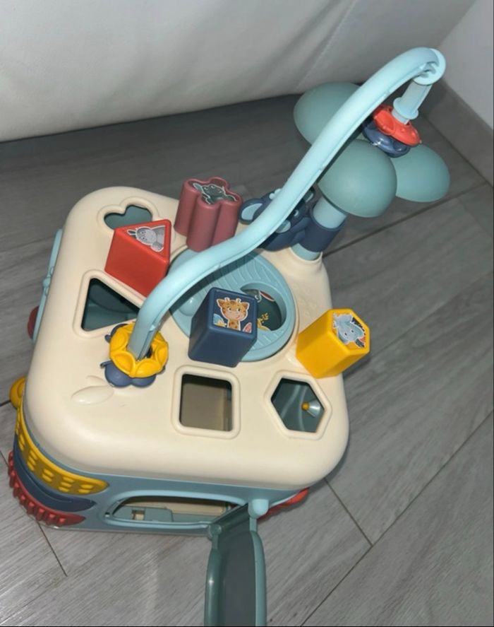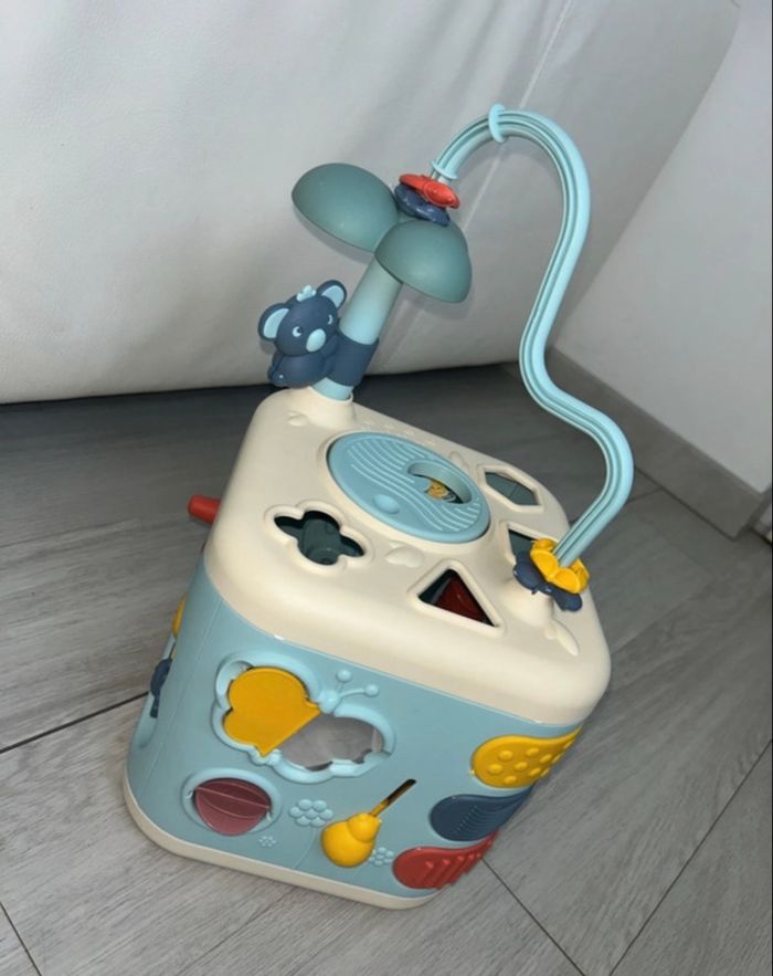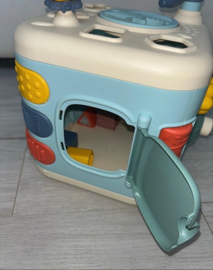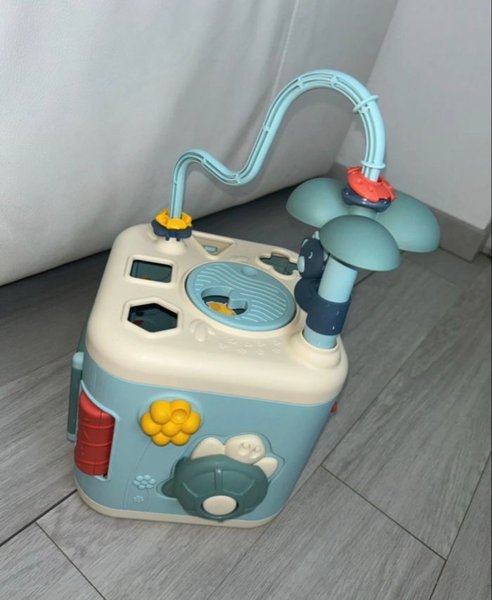 Parfait état Peu servit Cube d'activités 1er âge avec 5 faces proposant de nombreuses fonctions mécaniques pour s'amuser tout en développant sa motricité : trieur de formes composé de 4 formes, boulier, miroir papillon, engrenages, roue de la mare, coucou-caché tortue, fleur et coccinelle cric-crac, roue à aube et différents reliefs à toucher. Une porte permet de récupérer les formes à l'intérieur du cube.
