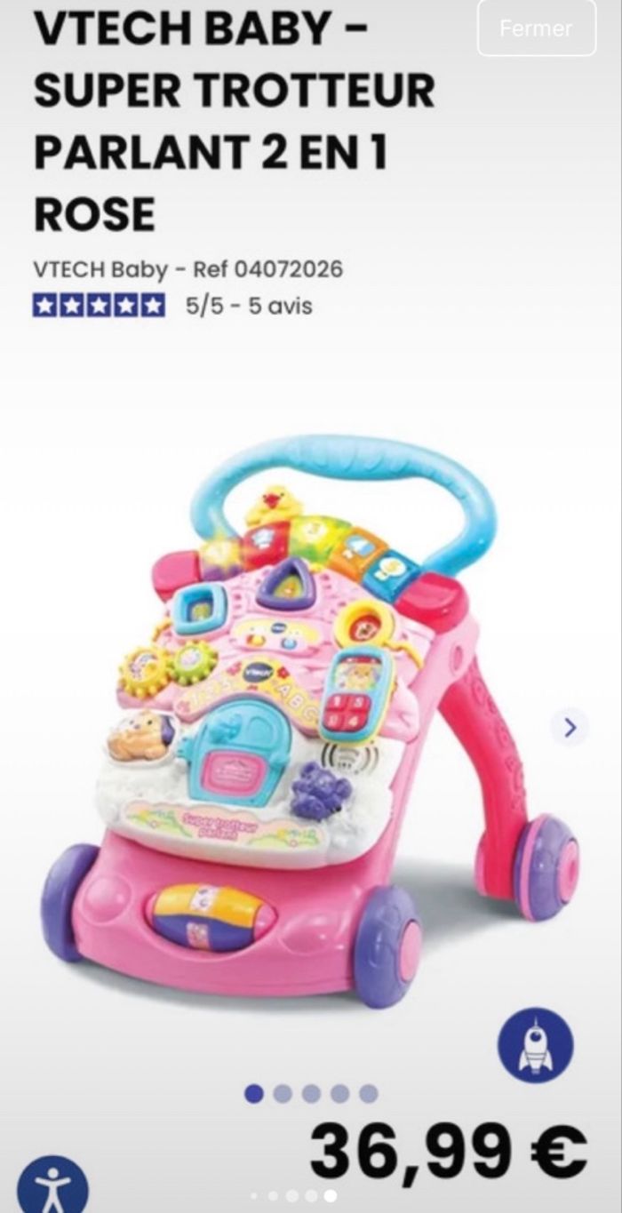 EN PARFAIT ÉTAT, comme neuf. Très peu servit À partir de 9 mois Super trotteur parlant 2 en 1 rose : pour accompagner votre bébé dans ses premiers pas Le super trotteur parlant 2 en 1 de la marque VTech est le jouet d'éveil idéal pour tous les bébés en pleine découverte et croissance. Un fantastique compagnon pour les tout-petits Ce super trotteur, de couleur rose attrayante, devient rapidement un compagnon fidèle dans le développement de vos tout-petits. Il offre une solution parfaite pour apprendre à marcher en toute sécurité tout en s’amusant. Se développer de manière ludique Le trotteur est équipé d’une poignée avec un capteur de mouvement. Dès que votre bébé fait le moindre mouvement, le trotteur émet des sons et des chansons immersives qui encouragent votre enfant à faire ses premiers pas. De plus, les boutons interactifs sur le tableau integré permettent à l'enfant de découvrir et d’apprendre les couleurs, les chiffres et les formes de manière ludique. Un jouet éducatif pour bébés Ce trotteur est spécialement conçu pour les bébés âgés de 9 à 36 mois en pleine exploration de leur environnement. Ses fonctionnalités spéciales font de lui un bon compagnon pour le développement de votre bébé. Les caractéristiques de ce trotteur Avec des dimensions de 33 x 45 x 46 cm (L x l x h), le super trotteur parlant VTech est parfaitement adapté aux enfants de bas âge. Il offre une stabilité grace à son système de freinage et apporte un soutien essentiel pour les premiers pas de vos petits. Le trotteur permet à votre bébé d’apprendre à son propre rythme grâce au tableau interactif alimenté par 2 piles LR6 fournies avec le pack. Les avantages de ce super trotteur parlant 2 en 1 rose Ce jouet contribue au développement de la motricité fine des bébés grâce son triage de 3 formes. En même temps, ce trotteur encourage votre enfant à s’exprimer d’avantages en se familiarisant avec des mélodies et les chansons.