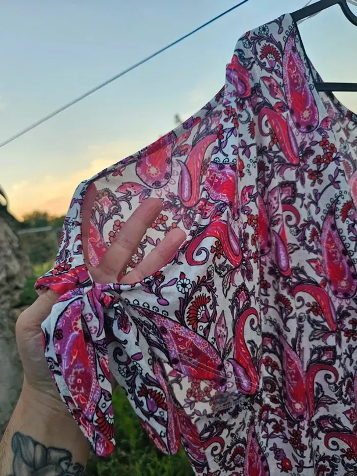 🌸 Tee-shirt/ blouse imprimé Paisley 🌸 Ajoutez une touche de couleur et de style à votre garde-robe avec ce joli top à imprimé paisley ! Parfait pour les journées décontractées, journée au bureau, une événement, un mariage, un anniversaire, au lycée ... 🌺✨ 👚 Taille : 54/56 🛍️ Neuf avec étiquette ! 💖 Détails : Magnifiques tons roses avec une coupe ample et légère. Des manches avec un joli nœud pour une touche fun ! 🎀 🚚 Envoi ULTRA rapide & soigné en 48h (hors week-end bien sûr 😉) 📦 Commandes passées le week-end ? Hop, départ dès lundi matin ! 🏡 Maison hyper clean, NON fumeur 🚭 & SANS animaux 🐶🚫 👉 Tes articles arrivent nickel, dans un état au top !✨ 🔍 Attention j'ai mis 54 car y'a pas 54/56 donx ce qui prime c'est la taille de l'étiquette si doute me demander les mesures.