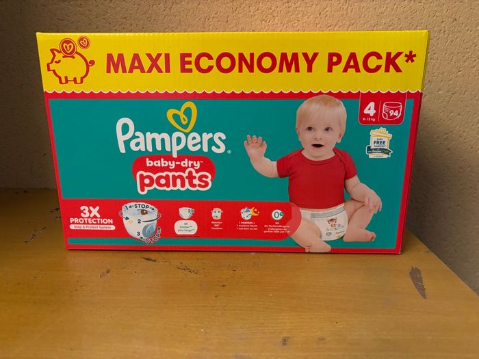 Vends x1 carton de 94 couches Pampers Pants taille 4. ⏱️Envoi rapide & soigné. ✅Carton neuf, jamais ouvert. Prix : 19,90€ le carton.