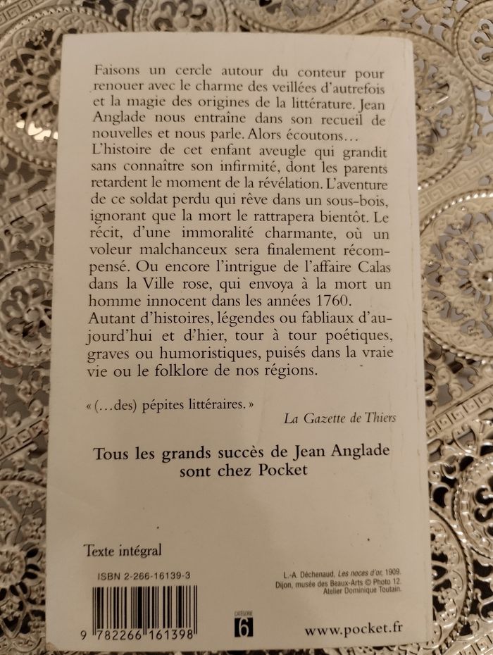 Product Description Faisons un cercle autour du conteur pour renouer avec le charme des veillées d'autrefois. Écoutons l'histoire de cet enfant aveugle qui grandit sans connaître son infirmité, l'aventure de ce soldat perdu qui rêve dans un sous-bois, ignorant que la mort le rattrapera bientôt. Ou encore l'intrigue de l'affaire Calas dans la Ville rose, qui envoya à la mort un homme innocent. Autant d'histoires d'aujourd'hui et d'hier, puisées dans la vraie vie ou le folklore de nos régions. " Des pépites littéraires. " La Gazette de Thiers About the Author Jean Anglade est né en 1915 à Thiers, en Auvergne, d'une mère domestique et d'un père ouvrier maçon. Formé à l'École normale d'instituteurs de Clermont-Ferrand, il enseigne à la ville, puis à la campagne, tout en continuant ses études, pour devenir professeur de lettres, puis agrégé d'italien. Il a trente-sept ans lorsqu'il publie son premier roman, Le chien du Seigneur. À partir de son dixième roman, La pomme oubliée (1969), il consacre la plus grande part de son œuvre à son pays natal, ce qui lui vaudra d'être surnommé le " Pagnol auvergnat ". Romancier – il a plus de trente-cinq romans à son actif –, mais aussi essayiste, traducteur (de Boccace et de Machiavel), il est l'auteur de plus de quatre-vingt-dix ouvrages et explore tous les genres : biographies (Pascal, Hervé Bazin), albums, poésie, théâtre, scénarios de films. Jean Anglade a beaucoup voyagé et habite aujourd'hui près de Clermont-Ferrand. Très bon état