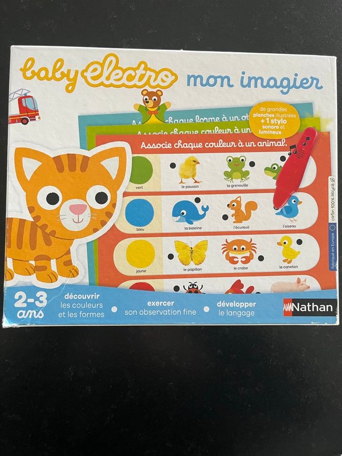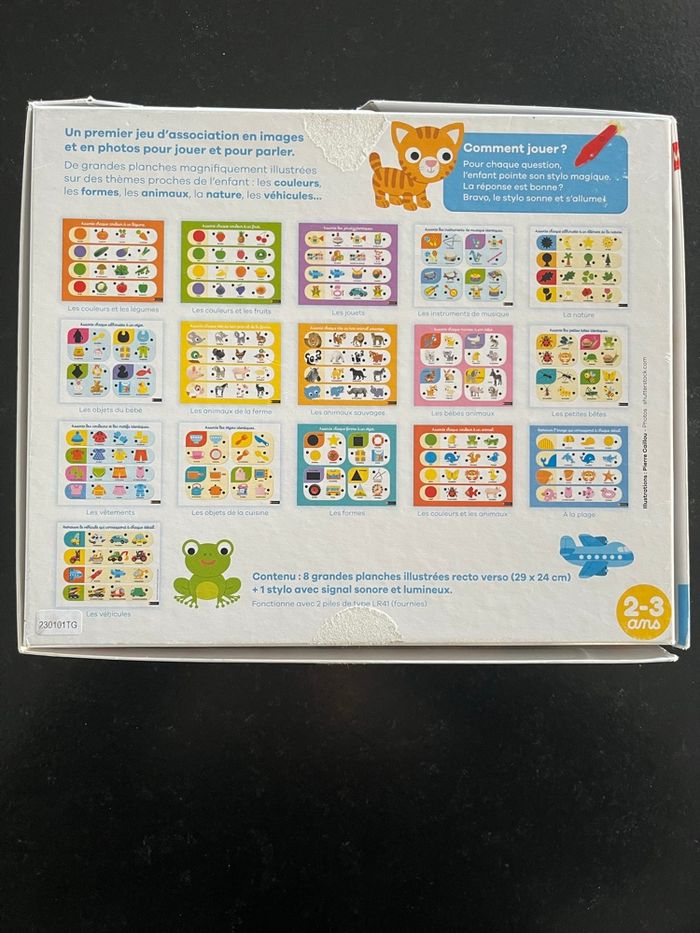 Jeux complet avec 8 fiches donc 16 thèmes et stylo avec pile qui fonctionne encore Bon état Grâce à cet électro baby imagier, l'enfant apprend les couleurs, les formes, les animaux, les véhicules... Pour répondre à la question qui lui est posée, il met son stylo sur une image. Si le stylo s'allume, il a trouvé la bonne réponse. Avec ce jeu interactif, l'enfant répond à des questions sur 16 thèmes différents, tout en jouant et en s'amusant.