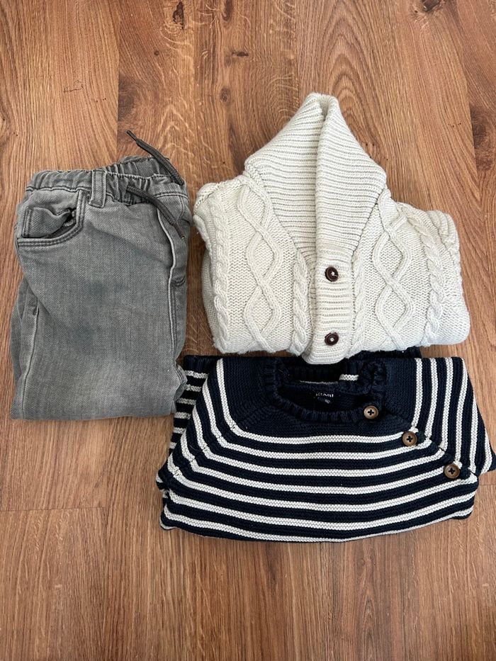 Lot 3 articles 24 mois comprenant : - 1 gilet blanc - 1 pull marinière - 1 pantalon gris En très bon état