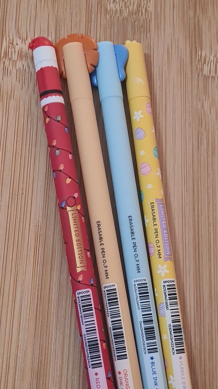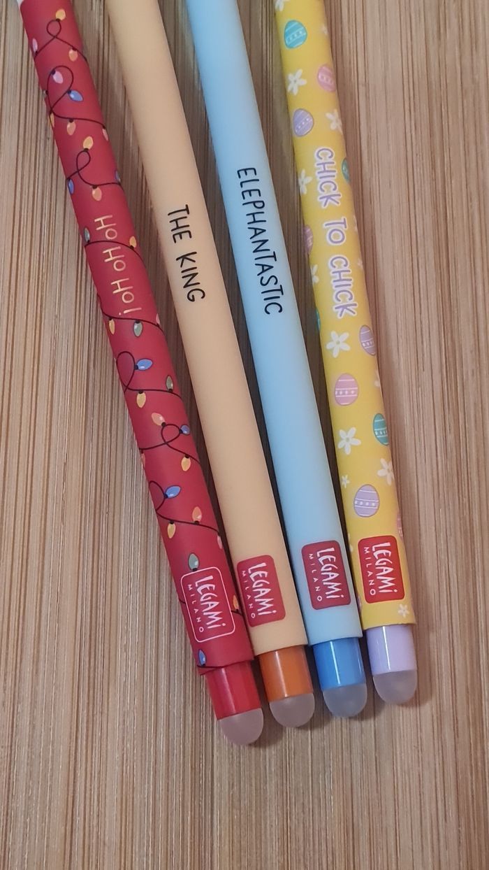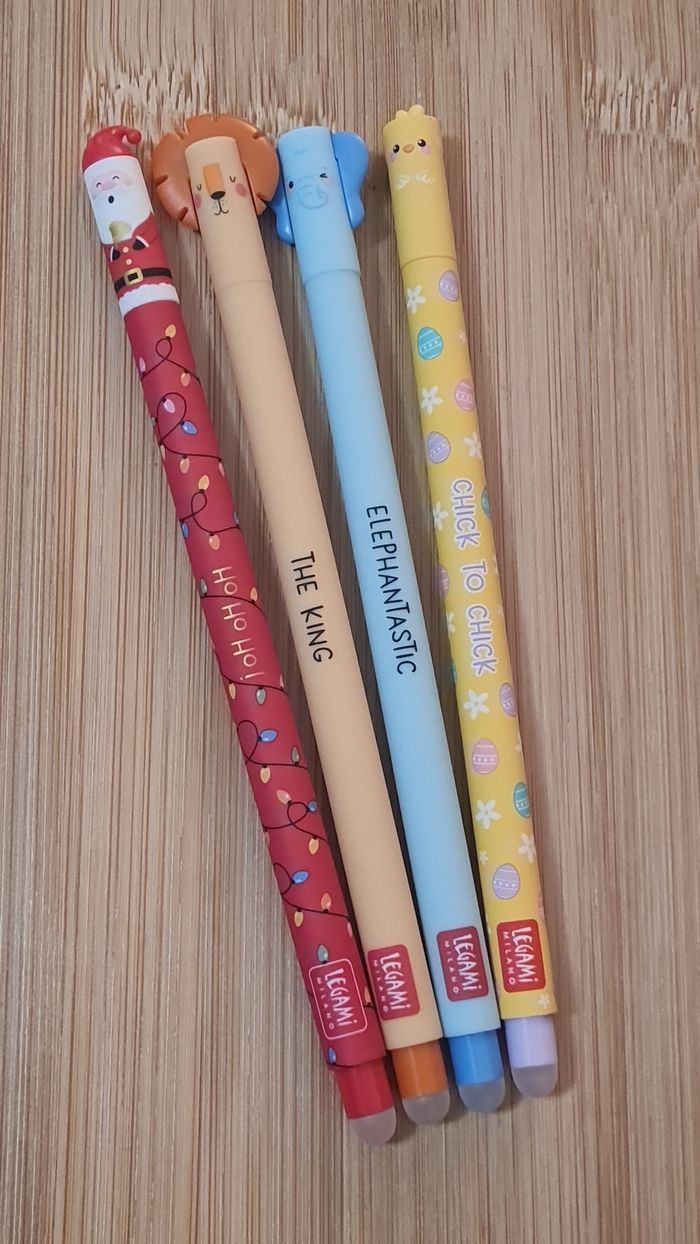 Legami Effaçables - NEUFS = 4 Stylos -> 1 Stylo Père Noel Rouge 🎅🏻 de la Collection NOEL 2024 : LIMITED EDITION -> 1 Stylo Poussin de Pâques 🐣 de la Collection PAQUES 2025 : LIMITED EDITION -> 1 Stylo Éléphant 🐘 -> 1 Stylo Lion 🦁 de la Collection SAVANE 2024 Éditions Plus Commercialisées Définitivement depuis de nombreux mois/année Neufs - Authentiques LEGAMI Au besoin, nous avons toutes les éditions Legami effaçables et lovely friends qui existent depuis leurs débuts en 2020, toutes les éditions les plus recherchées, tout n'est pas encore en ligne, nous demander 🥰