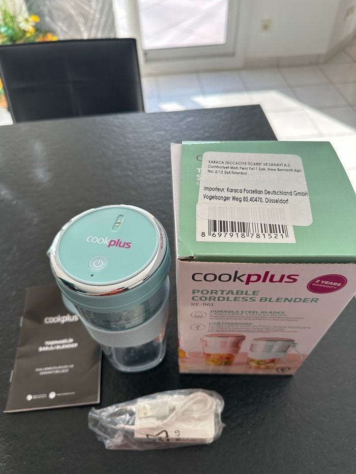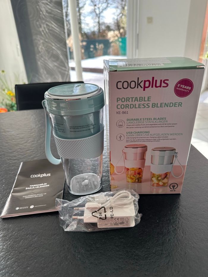 Blender sans fil portable Cookplus Hache et broie les fruits et légumes grâce à son moteur de 60 W. Lames en acier durable. Chargement USB pour une utilisation pratique. Câble de chargement inclus. Idéal pour l emmener en pique nique. Neuf avec étiquette