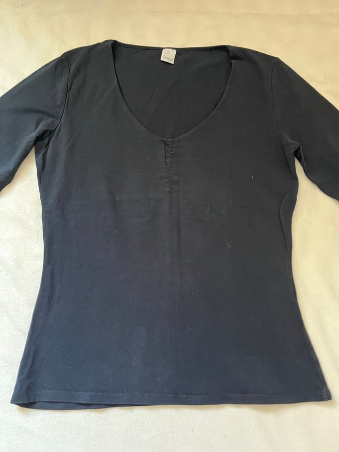 vends ce pull fin ou T-shirt marque camaïeu taille 4 mais taille plus petit plutôt L Col en V manches mi longues demie largeur aux aisselles 46 cm longueur 62 cm couleur noire 1 euro Mes autres annonces de vêtements pour femme de L à M #lma42femmeL #lma42femmeM