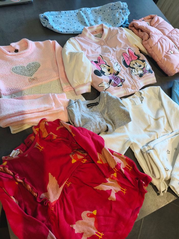 certains articles sont étiquetés en taille 12 mois mais taille grand. Ce lot en très bon état comprend : Une doudoune sans manche Une veste Disney Minnie Un pantalon type jogging 2 robes Un gilet 2 ensembles (le blanc et rose est plutôt en bon état (plus porté, petites bouloches))