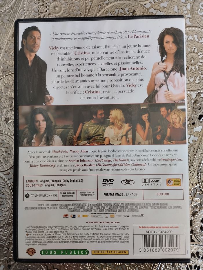 Je vends le film "Vicky Cristina Barcelona" en DVD. - Type de produit : DVD - Titre : Vicky Cristina Barcelona - Type de contenu : Film - Réalisateur : Woody Allen - Acteurs principaux : Javier Bardem, Penélope Cruz, Scarlett Johansson - Langues audio : Anglais, Français (Dolby Digital 3.0) - Sous-titres : Anglais, Français Bon état.