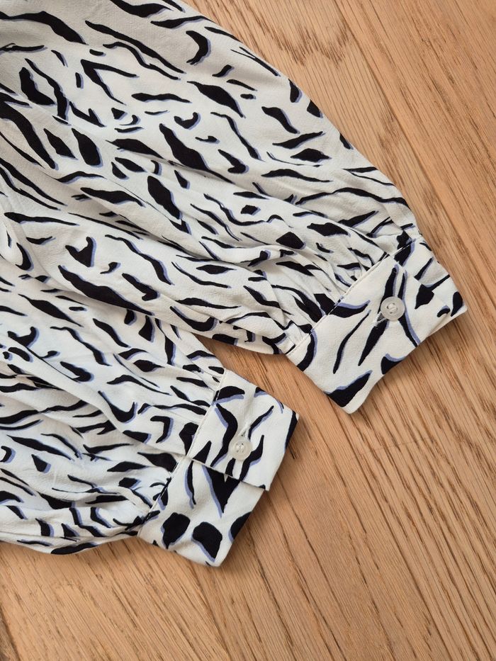 Chemise pour femme, état neuf jamais portée - Marque : Esprit - Taille : étiquette coupée, convient pour un 34 - 36 - Largeur aux aisselles : 43 cm, largeur épaules : 28 cm, hauteur : 62 cm environ - Manches bouffantes - Coloris : blanc, imprimé tigre félin / animal noir avec ombre bleue - Lavable en machine à 30°C - Maison non fumeur et sans animaux #elfedneigesfemme #elfedneiges34 #elfedneiges36