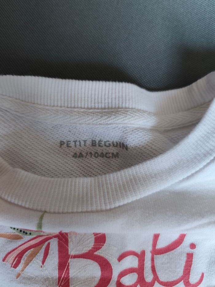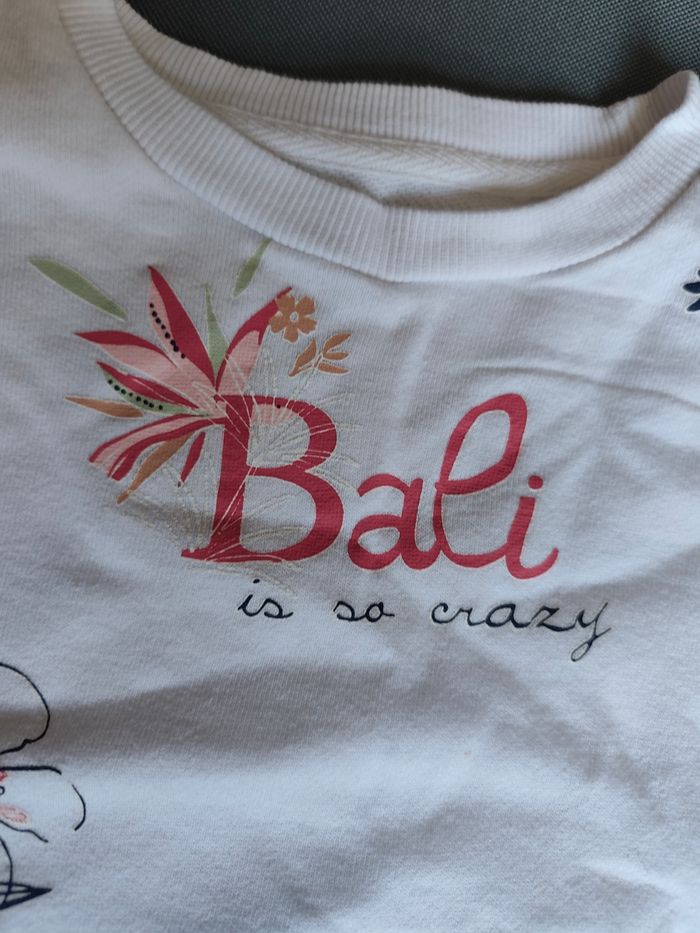 ​ SWEAT FIN FLEURI "BALI" ​Joli sweat-shirt fin de couleur blanche avec de charmants volants aux épaules. Il arbore une illustration tropicale avec des fleurs colorées et l'inscription "Bali is so crazy". Un haut léger et confortable, idéal pour la mi-saison. ​🔸 Marque : Petit Béguin 🔸 Taille : 4 ans / 104 cm 🔸 État : Très bon état. A noter une petite tache sur le devant (cf photo)
