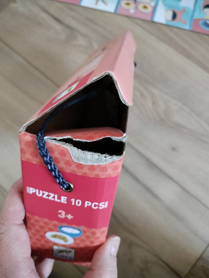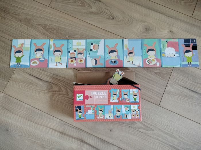 Puzzle 10 pièces sur le déroulement de la journée des enfants La boîte est abîmée mais cela n'empêche pas l'utilisation du puzzle.