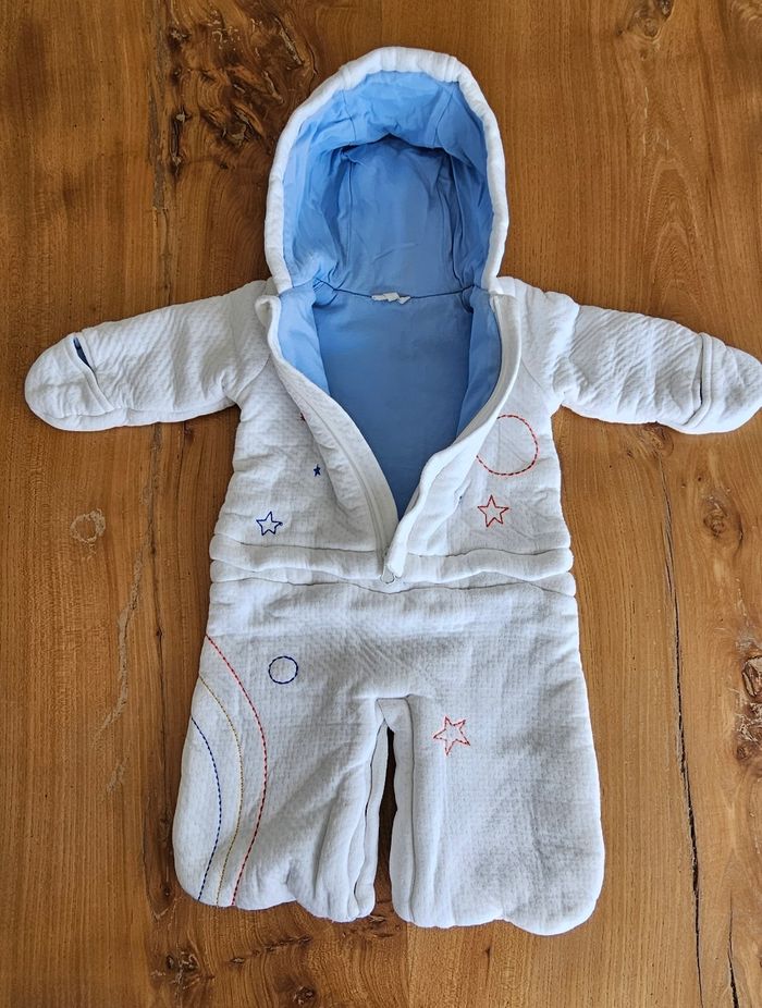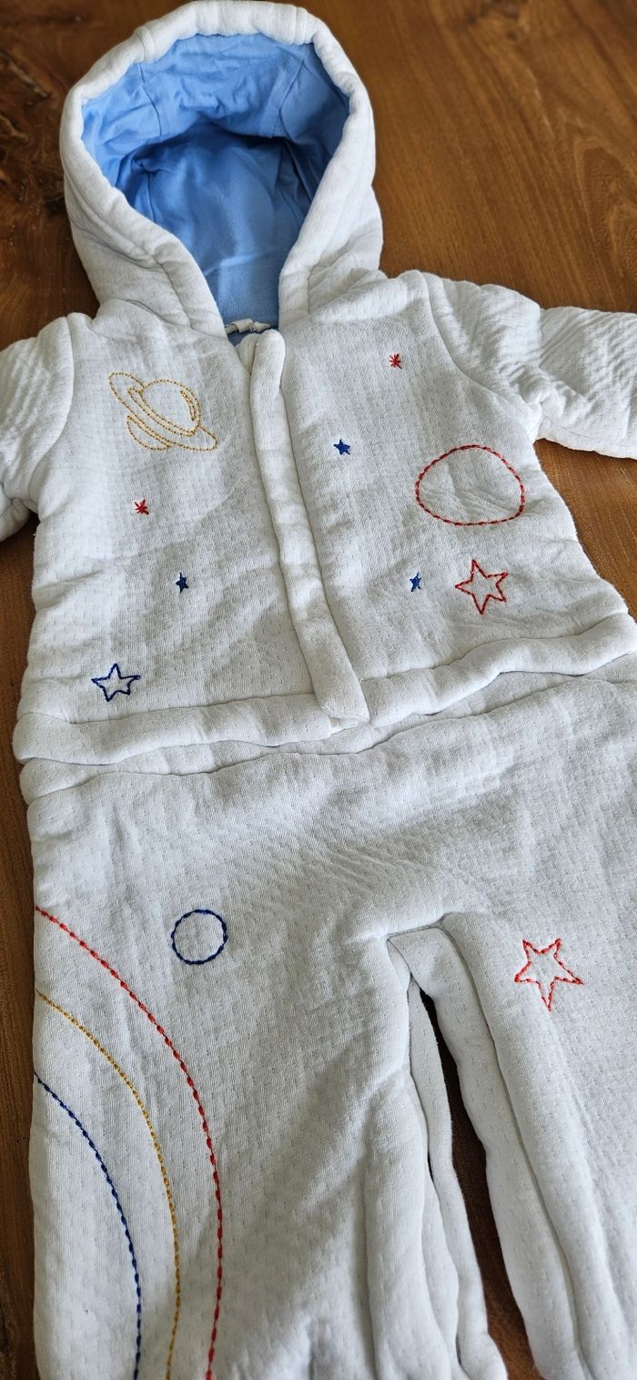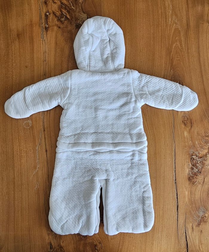 Combi-pilote chaude bébé garçon, blanche avec motifs brodés sur l'ensemble de la combi. Ouverture zippée sur le devant et pressionnée à l'entrejambe et à la taille. Porté mais reste en très bon état (petit point de peinture qui s'est enlevé sur la fermeture éclair, voir photo). Aucune tâche, ni trou 👌