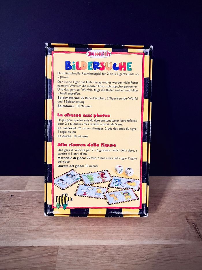 Superbe jeu de société vintage Janosch - Bilder Suche (La chasse aux photos / Alla ricerca delle figure) édité par Schmidt Spiele en 2001. Jeu de réaction ultra-rapide illustré par le célèbre auteur/illustrateur allemand Janosch (personnages adorables : Petit Tigre, Petit Ours, Grenouille, etc.). Pour 2 à 6 joueurs dès 5 ans, parties courtes et dynamiques (~10-15 min). Mécanisme : lancez les 2 dés illustrés, et soyez le plus rapide à repérer l’objet correspondant sur les grandes cartes photos détaillées et humoristiques. Le premier qui tape dessus gagne la carte ! Complet : toutes les cartes photos, les 2 dés spéciaux, la règle du jeu en italien (mais le jeu est multilingue et très simple à comprendre sans texte). État : Très bon état, cartes et dés comme neufs, proprement conservés. Boîte légèrement usée aux coins et bords (traces normales du temps, voir photos), mais solide et complète. Pièce culte pour fans de Janosch, collectionneurs de jeux vintage Schmidt Spiele, ou familles cherchant un jeu d’observation et de vitesse intemporel et sans écran ! Parfait pour soirées fun en famille ou entre amis. Envoi soigné ou remise en propre possible sur Neuilly sur Seine. N’hésitez pas à m’écrire pour plus d’informations.