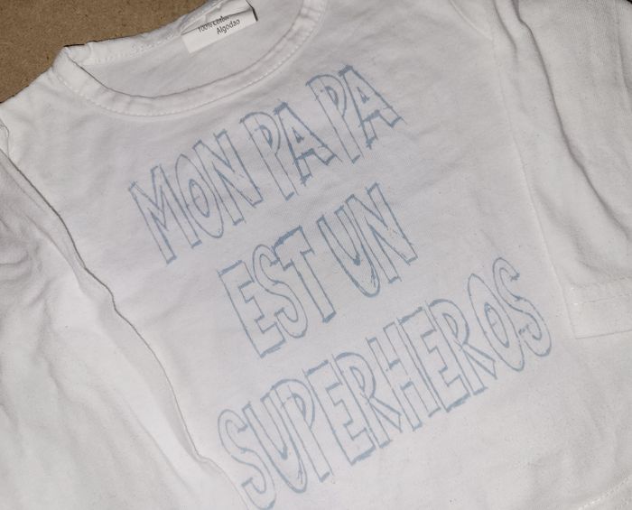 Vends ce joli t-shirt blanc à manches longues pour bébé garçon. Message : "Mon papa est un superhéros" écrit en bleu (style dessin/esquisse). Taille : 6 mois. Matière : 100% Coton (doux pour la peau de bébé). Détails pratiques : Boutons pressions au niveau de l'épaule pour faciliter l'habillage. État : Très bon état. Maison non-fumeur. Envoi rapide et soigné.