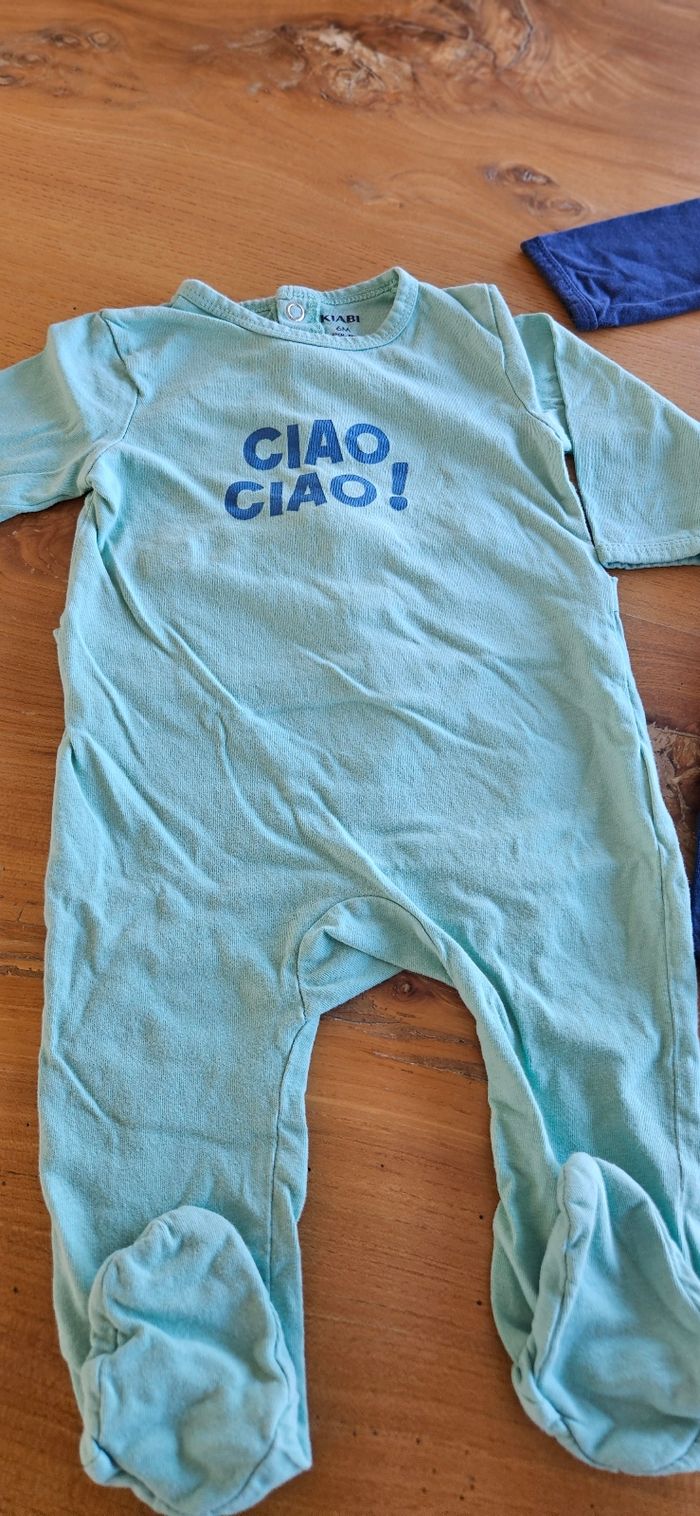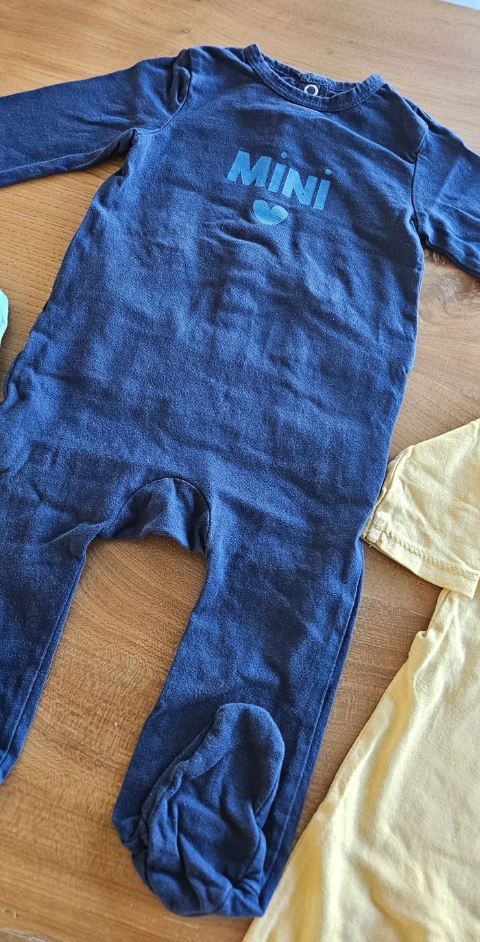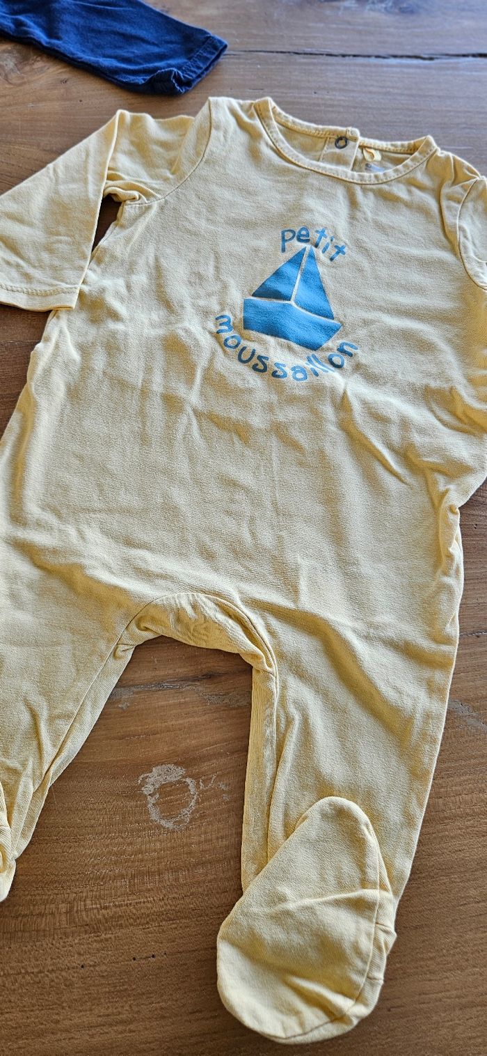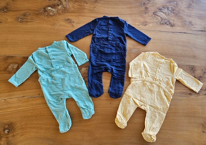 Lot de 3 pyjamas légers bébé garçon : • 1 bleu ciel (Kiabi) • 1 jaune (Orchestra) • 1 bleu marine (Kiabi) Ouverture pressionnée dans le dos. Porté peu de fois donc en parfait état. Aucune tâche, ni trou 👌