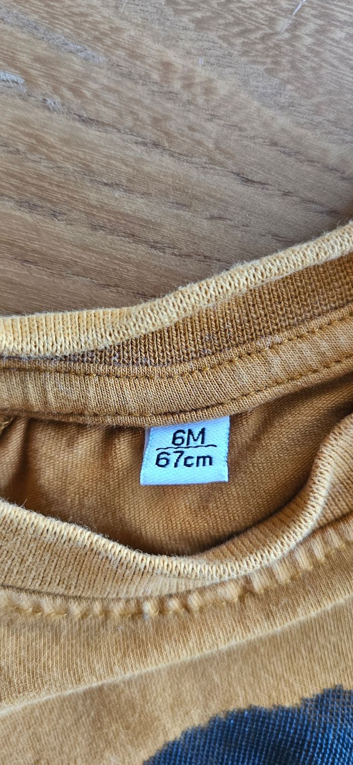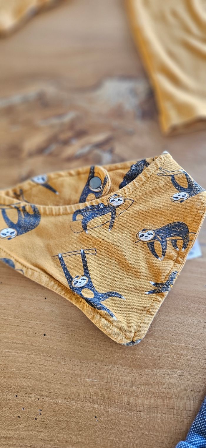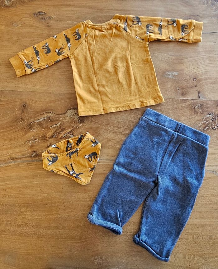 Ensemble bébé garçon : • Tee shirt manches longues marron. Dessin imprimé sur le devant. Ouverture pressionnée à l'épaule. • Pantalon chaud bleu/gris. Élastique à la taille. • Bavoir bandana Porté peu de fois donc en parfait état. Aucune tâche, ni trou 👌