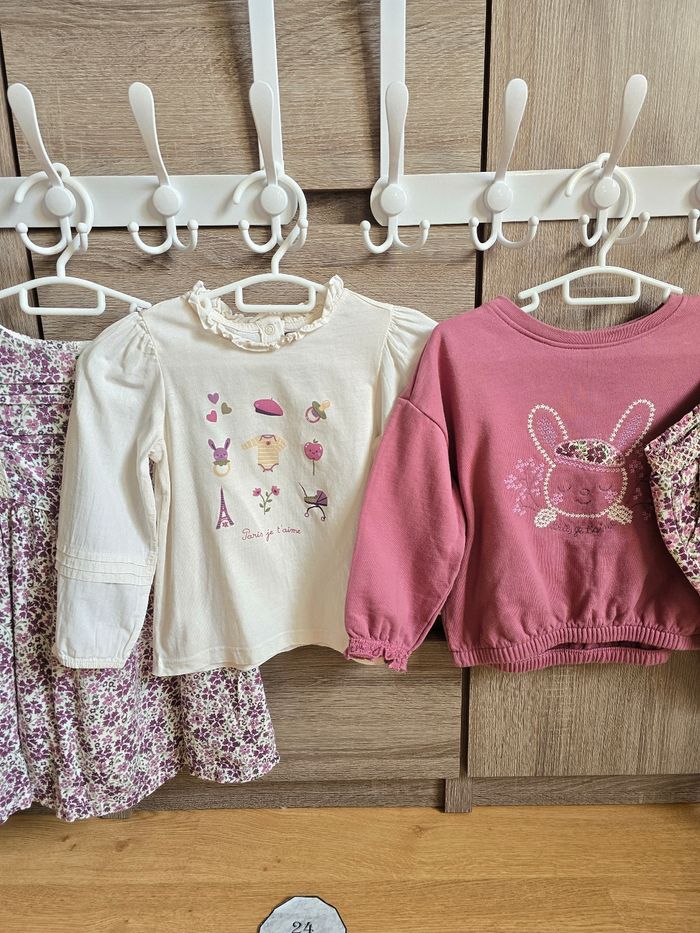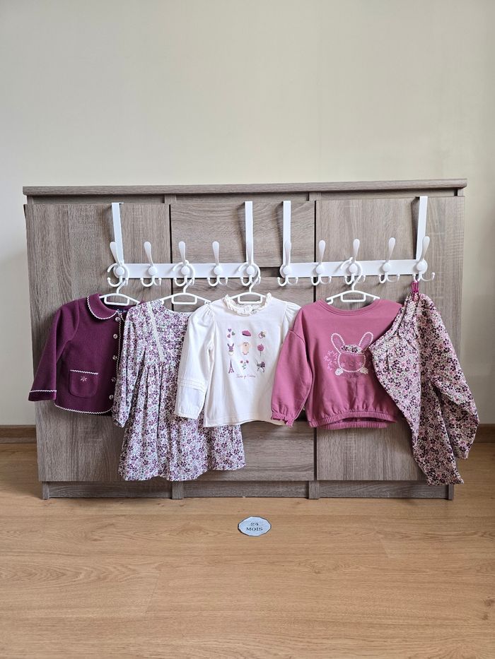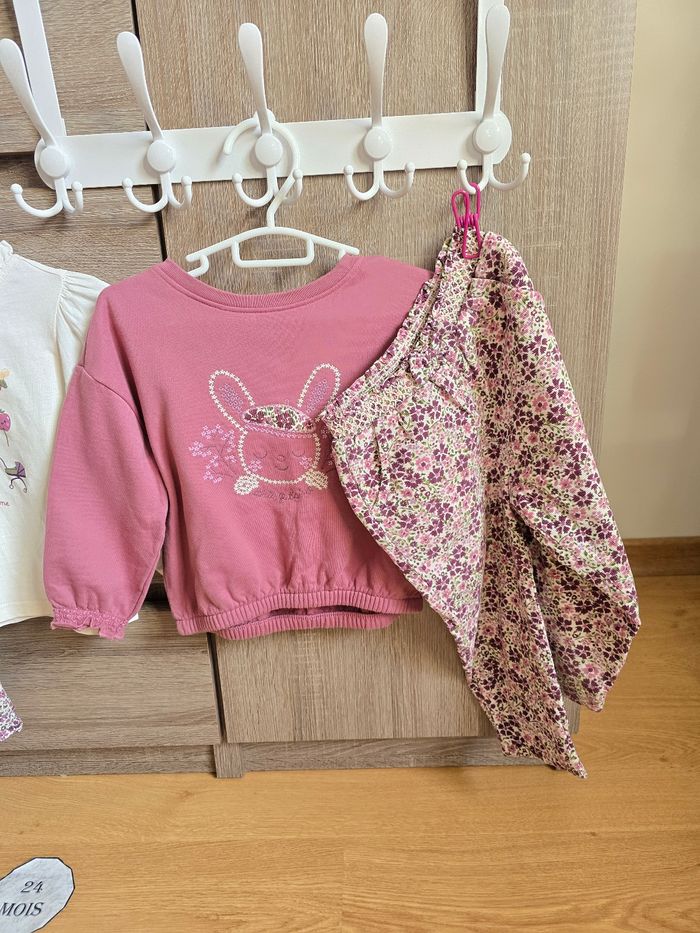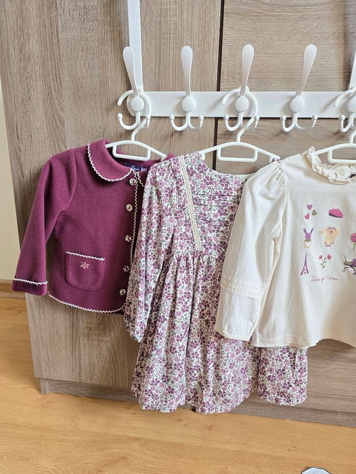 Lien direct vers les tailles équivalentes dans mon dressing : #fdhsarah24mois #fdhsarahSGMJ 📜 Lot comprenant 5 pièces - Gilet en polaire agrémenté de deux poches avant ornées de broderies fleuries parme et vert olive. Boutons imprimés fleuri Ref : LAJUNE - Robe manches longue amples avec plissage. Imprimé fleuri violet fonce, parme et vert sur fond écru. Détails en dentelle sur buste avec plissage. Ref : LAJANE - Pull/sweat ample avec un lapin brodé au centre avec l'inscription "Paris, je t'aime'. Poignets élastiqués avec smocks. Ref : LAJUSTINE - T-shirt à manches longues bouffantes, imprimé fantaisie bébé parme, mauve et vert olive. Ref : LAJULIA - Pantalon en velours côtelé, imprimé fleuri violet foncé, parme et vert sur fond écru. Taille smocks et élastiquée. Ref : LAJOSEFINE Collection : Chouquette à Paris Taille 📏 : 24 mois 86 cm État 🔍 : Très bon état Marque 🏷️ : Sergent Major Je suis disponible pour toutes questions ou photos supplémentaires. 📦 L’envoi se fait le plus rapidement possible Bon Shopping #fdhxxx24xxx
