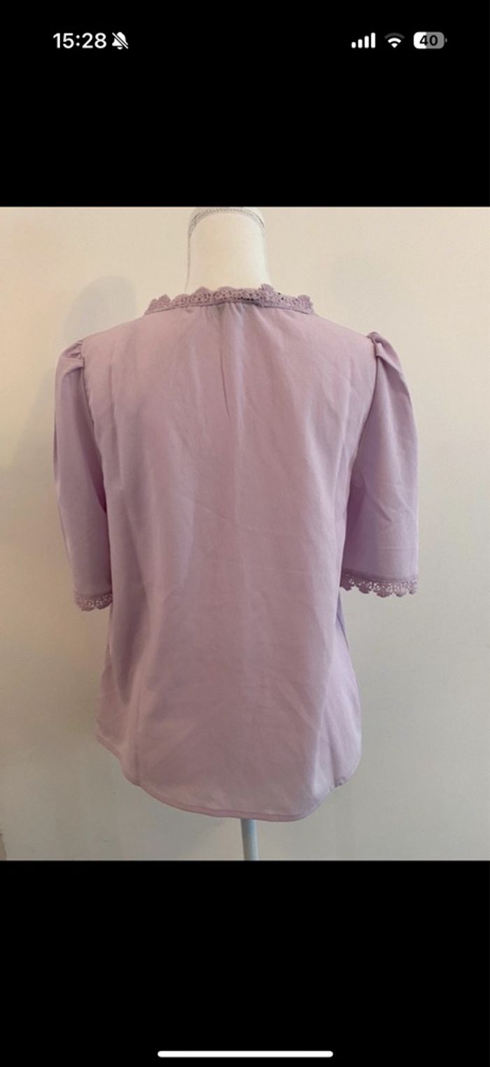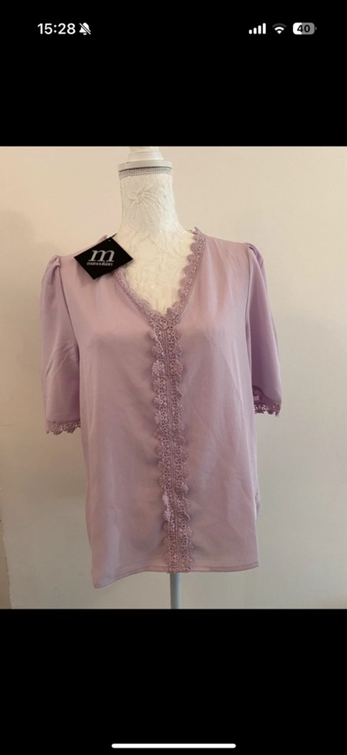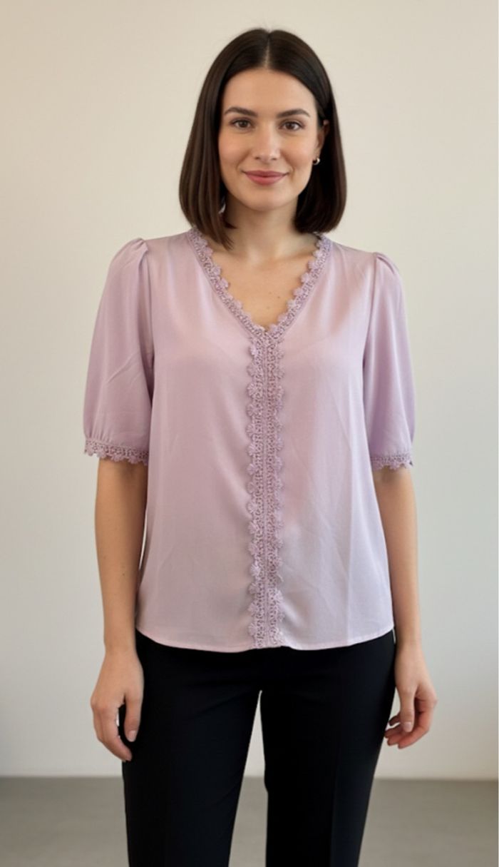 Blouse féminine et élégante, parfaite pour un look de bureau ou une tenue décontractée chic. 📐 Taille : 40 🏷️ Marque : Manoukian 🔖 Neuf avec étiquette 🎨 Couleur : mauve pâle 🧵 Matière : 100% polyester ✅ Manche 3/4, col en V flatteur, bordé d'un galon en dentelle guipure assortie.
