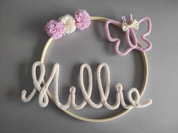 Tricotin prénom avec décoration papillon Diamètre cercle bois 22 cm Neuf