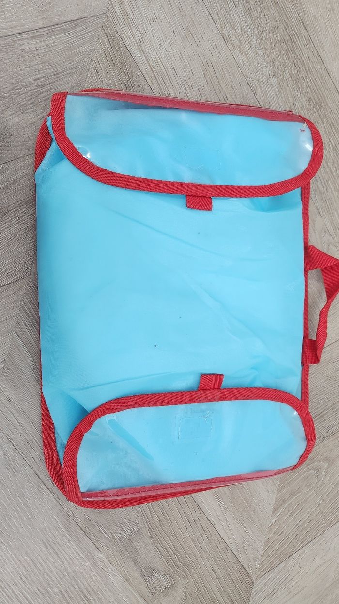 Planche a poser sur les jambes pour dessiner. A l'avant, des élastiques pour maintenir la feuille A4. A l'arrière, 2 pochettes plastique avec fermeture éclair pour ranger les crayons.