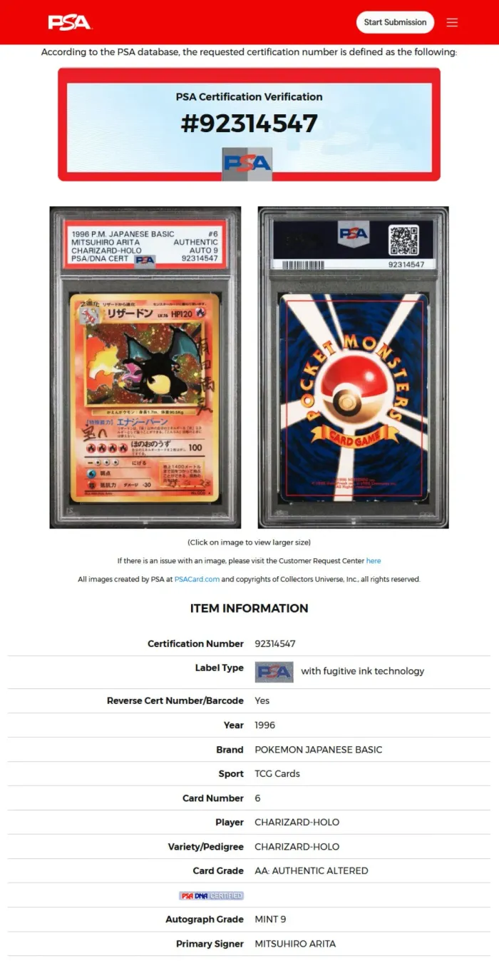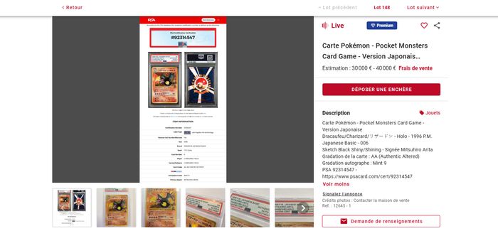 🔥"EXCEPTIONNEL"🔥 Charizard/Dracaufeu Holo **BLACK SKETCHED DRACAUFEU SHINY/SHINING** de 1996 Japonais #006 Base set. ✅ 100% AUTHENTIQUE!!!!! Voir photo 5 ✅ ✅🚩Carte expertisée 30000 € / 40000 € 🚩 (voir photo 6 et 7).✅ **DRAGON COLORED COLORIÉ EN NOIR PAR MITSUHIRO ARITA ET SIGNÉE PAR MITSUHIRO ARITA EN JAPONAIS** . Cette carte Pokémon **BLACK SKETCHED DRACAUFEU SHINY/SHINING** Holo de 1996 est un incontournable pour les collectionneurs. CE **BLACK SKETCHED DRACAUFEU SHINY/SHINING** JAPONAIS EST UNE CARTE UNIQUE EN SON GENRE ET UNE VARIANTE 1 SUR 1 🔥🌍UNIQUE AU MONDE🌍🔥 Autographe « Coloré Sketch » de (DRACAUFEU SHINY/SHINING) par **MITSUHIRO ARITA**: "Cette carte particulière est encore plus spéciale car elle a été personnellement signée et le Charizard/Dracaufeu colorié en noir par le déssinateur **MITSUHIRO ARITA** l'artiste renommé à l'origine de nombreuses illustrations emblématiques de Pokémon et carte Authentifiée *AUTO 9 par PSA* ce qui la rend vraiment unique en son genre." La signature est "Sur" la carte et non sur le boitier. Cette carte Dracaufeu/Charizard colorié en noir (SKETCH DRACAUFEU SHINY/SHINING) et signée par **MITSUHIRO ARITA** est UNIQUE au monde sur le marché des cartes Pokemons. Cette carte se démarque incontestablement des autres. Unique carte Dracaufeu/Charizard #006 Japonaise de 1996 modifiée en (SKETCH DRACAUFEU SHINY/SHINING) par **MITSUHIRO ARITA** lui meme,***UNIQUE-INTROUVABLE!!!***, devient instantanément une oeuvre, un symbole de valeur et de rareté. Ne manquez pas l’opportunité de posséder cette carte RARE et 🔥🌍UNIQUE AU MONDE🌍🔥!!! Un ajout fantastique à toute collection ou comme investissement.💲💲 **Comme n'importe quel objet de collection, l'ancienneté "carte #006 Japonaise de 1996" et la rareté **BLACK SKETCHED SHINY/SHINING COLORED ET SIGNÉE PAR MITSUHIRO ARITA EN JAPONAIS** font souvent bon ménage avec la valeur. Plus un produit est rare, plus sa valeur a tendance à monter avec le temps.**