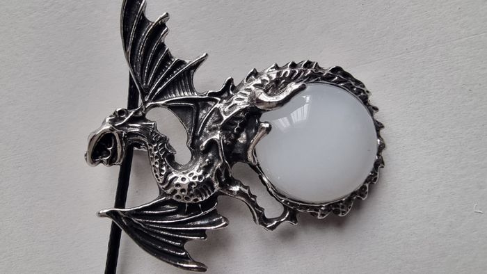 Lacet noir aspect cuir 45 cm de longueur totale dont 5 cm de chainette Pendentif Dragon en métal argenté sur une pierre blanche de 4 cm de hauteur Fermeture par mousqueton Pierre: agathe blanche Possibilité de rajouter un sachet en organza gratuitement sur demande pour offrir Punk Rock Gothique Neuf