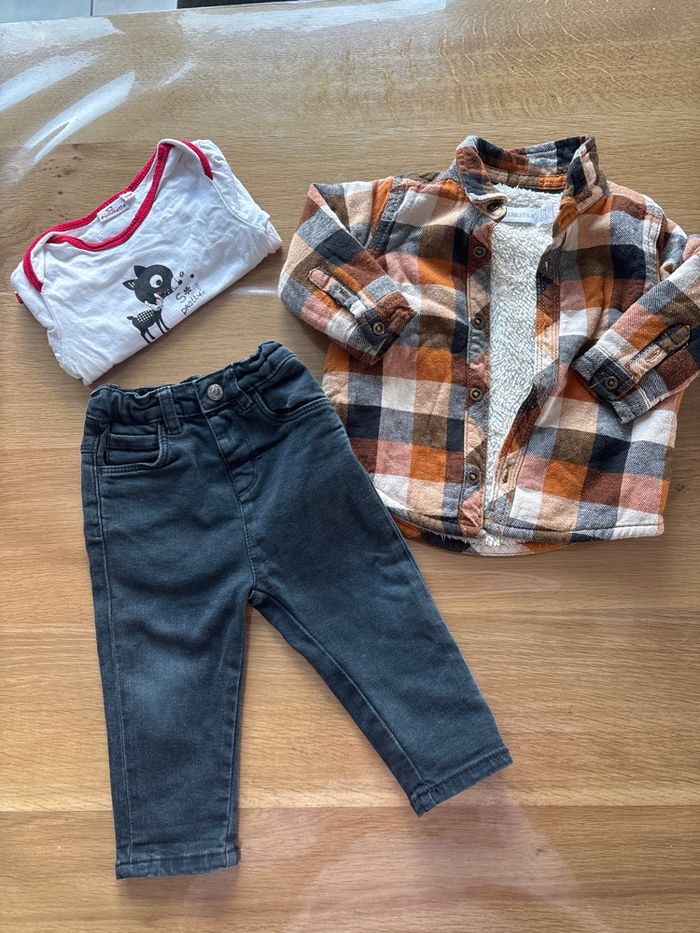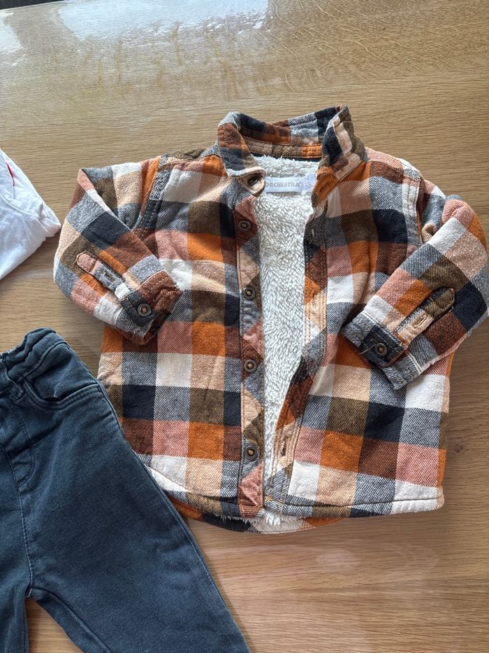 Ensemble Orchestra taille 12 mois, très bon état, comprenant : • Chemise à carreaux double épaisseur et chaude, parfaite pour l’hiver • Pantalon noir délavé, confortable et pratique Bonus : 1 bodie Pommette 12 mois offert avec l’ensemble 🎁 Idéal pour un look élégant et confortable pour bébé. Porté mais en très bon état, sans taches ni défauts. 📦 Envoi rapide 👶 Maison non-fumeur
