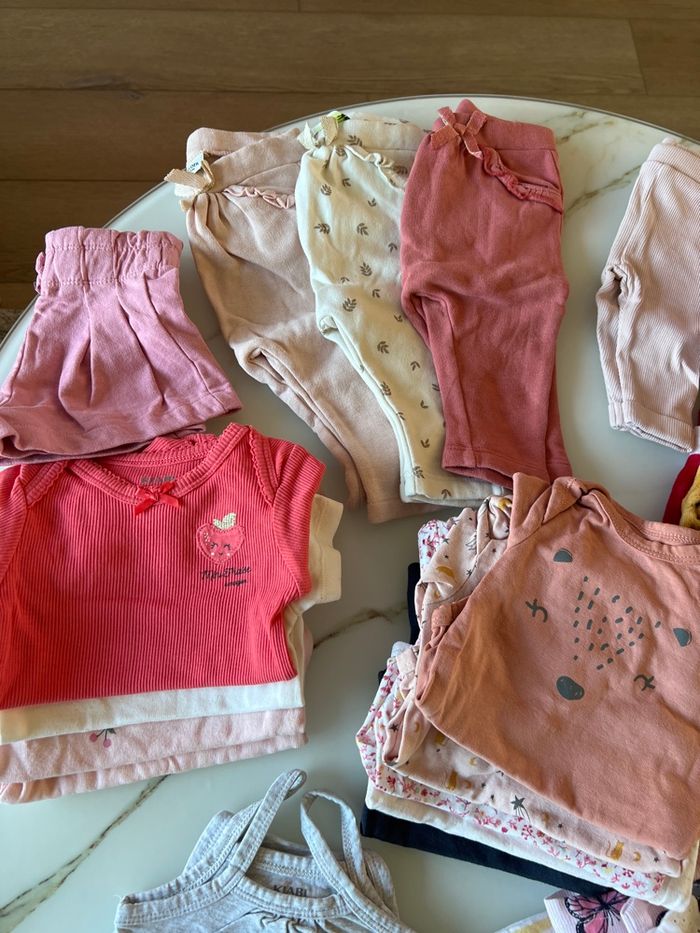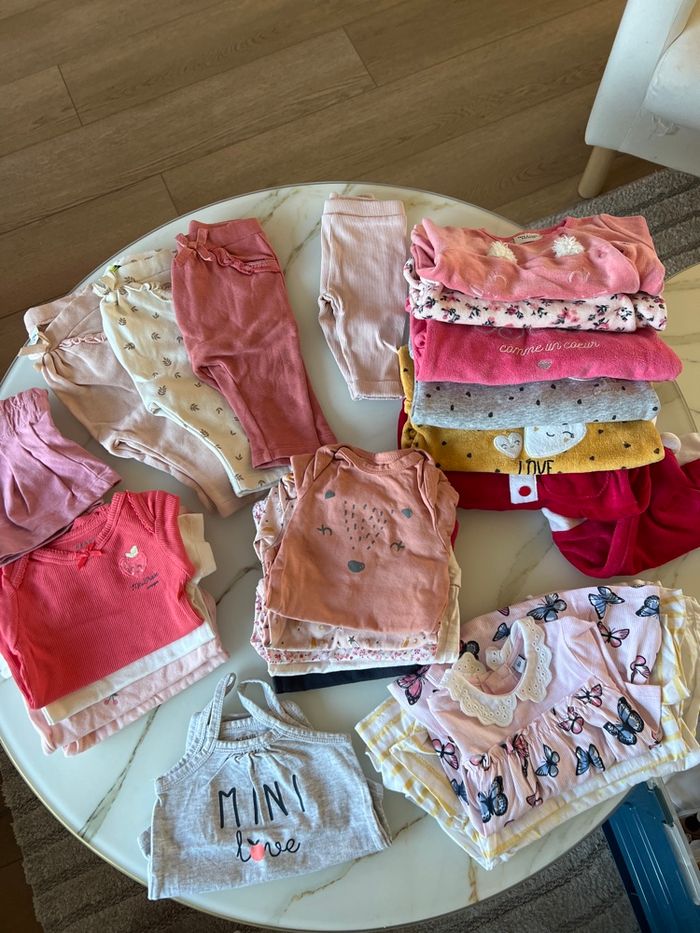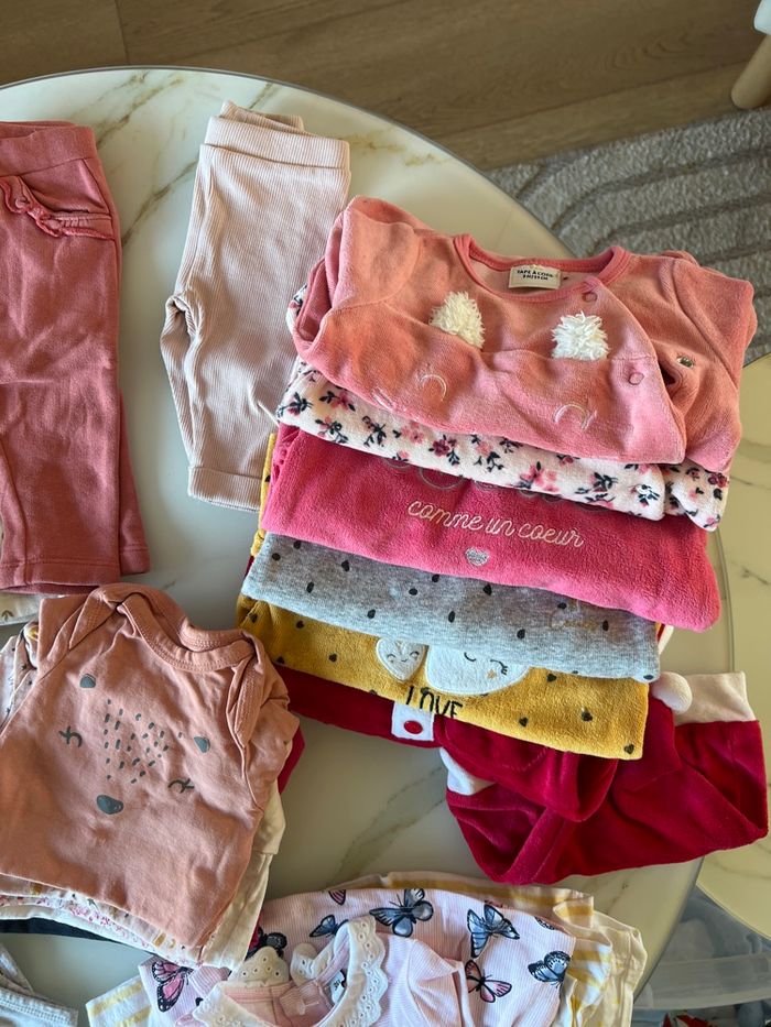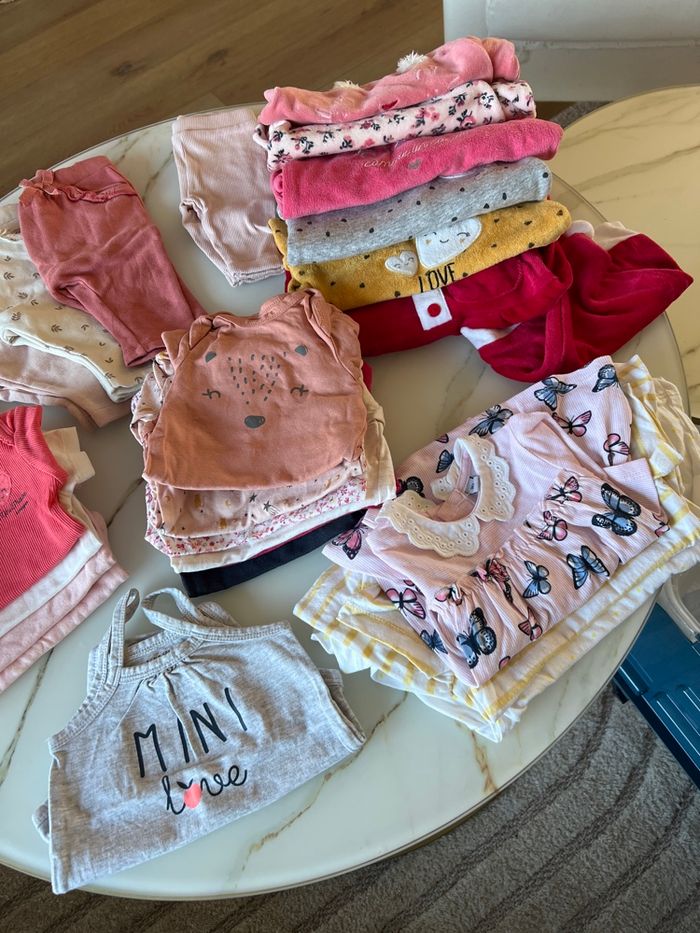 Lot en très bon état et quelques pièces avec taches légères. Lot qui comprend : 5 pyjamas hiver 1 pyjama de noël 6 bodies manches longues 4 bodies manches courtes 1 body bretelles 1 short 4 pantalons 3 robes Marques: tape à l’œil, H&M, Kiabi,